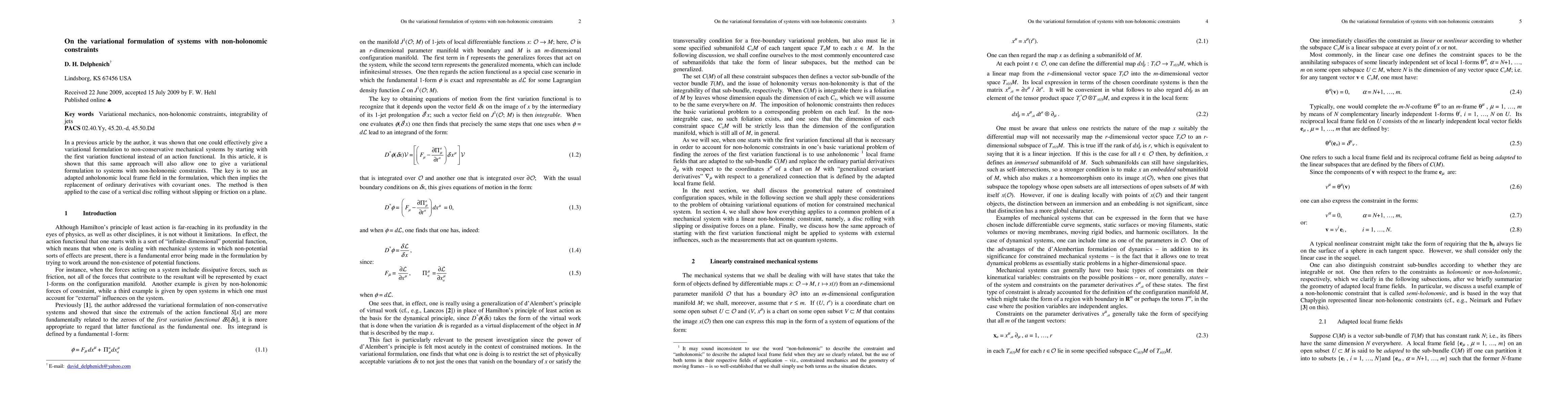 This paper extends the variational formulation to non-holonomic mechanical systems by employing an adapted anholonomic local frame field, replacing ordinary derivatives with covariant ones. The method is demonstrated through the example of a vertical disc rolling without slipping or friction on a plane.