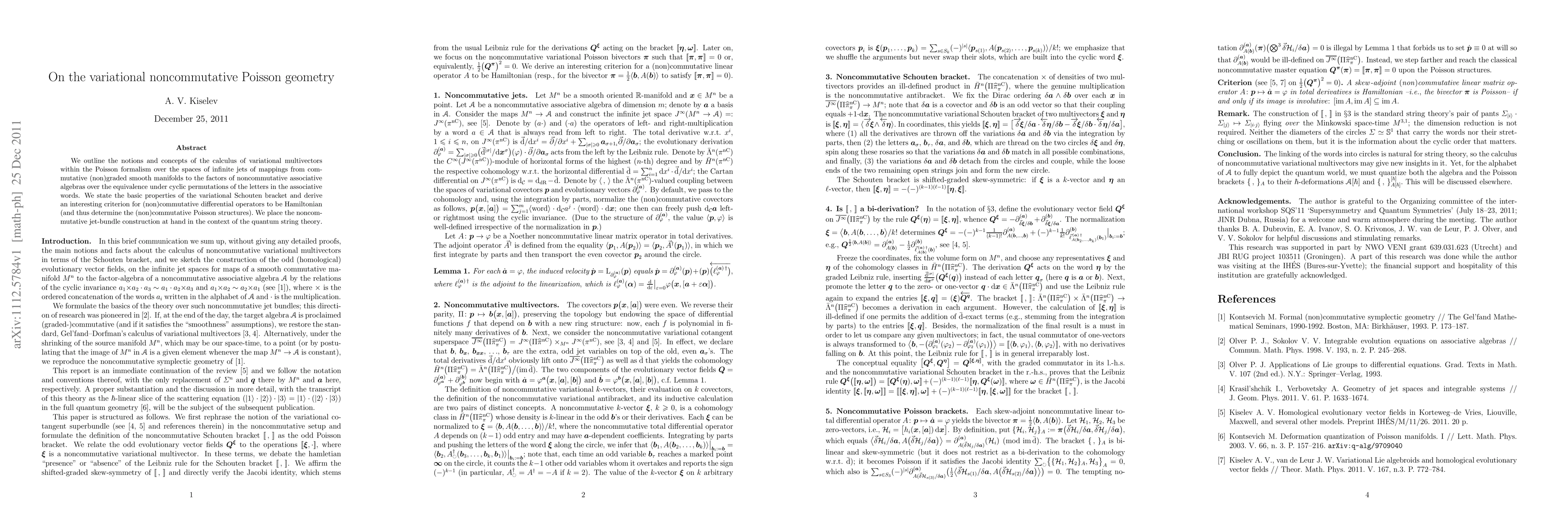 We outline the notions and concepts of the calculus of variational multivectors within the Poisson formalism over the spaces of infinite jets of mappings from commutative (non)graded smooth manifolds to the factors of noncommutative associative algebras over the equivalence under cyclic permutations of the letters in the associative words. We state the basic properties of the variational Schouten bracket and derive an interesting criterion for (non)commutative differential operators to be Hamiltonian (and thus determine the (non)commutative Poisson structures). We place the noncommutative jet-bundle construction at hand in the context of the quantum string theory.