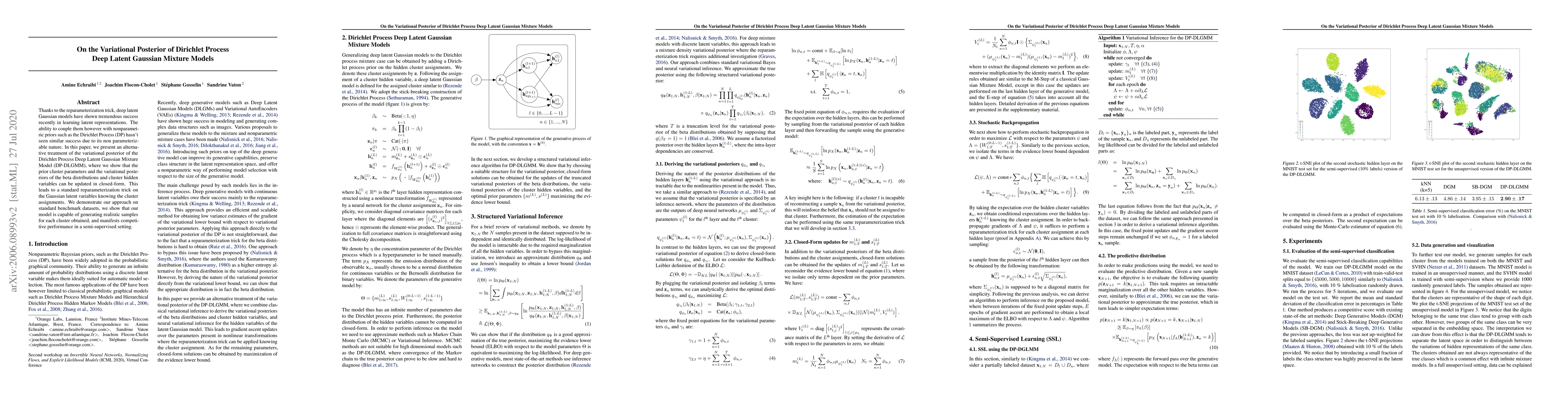 This paper proposes a method to update the variational posterior of Dirichlet Process Deep Latent Gaussian Mixture Models (DP-DLGMM) using closed-form solutions, enabling the application of the reparameterization trick. The approach demonstrates competitive performance and the ability to generate realistic samples in semi-supervised settings.