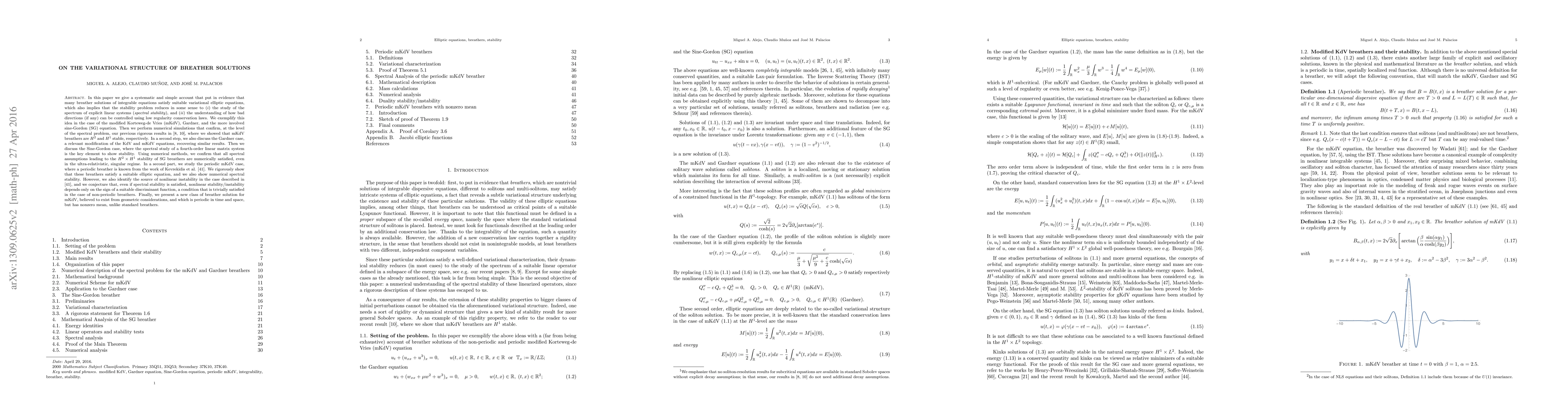 In this paper we give a systematic and simple account that put in evidence that many breather solutions of integrable equations satisfy suitable variational elliptic equations, which also implies that the stability problem reduces in some sense to $(i)$ the study of the spectrum of explicit linear systems (\emph{spectral stability}), and $(ii)$ the understanding of how bad directions (if any) can be controlled using low regularity conservation laws. We exemplify this idea in the case of the modified Korteweg-de Vries (mKdV), Gardner, and sine-Gordon (SG) equations. Then we perform numerical simulations that confirm, at the level of the spectral problem, our previous rigorous results, where we showed that mKdV breathers are $H^2$ and $H^1$ stable, respectively. In a second step, we also discuss the Gardner and the Sine-Gordon cases, where the spectral study of a fourth-order linear matrix system is the key element to show stability. Using numerical methods, we confirm that all spectral assumptions leading to the $H^2\times H^1$ stability of SG breathers are numerically satisfied, even in the ultra-relativistic, singular regime. In a second part, we study the periodic mKdV case, where a periodic breather is known from the work of Kevrekidis et al. We rigorously show that these breathers satisfy a suitable elliptic equation, and we also show numerical spectral stability. However, we also identify the source of nonlinear instability in the case described in Kevrekidis et al. Finally, we present a new class of breather solution for mKdV, believed to exist from geometric considerations, and which is periodic in time and space, but has nonzero mean, unlike standard breathers.