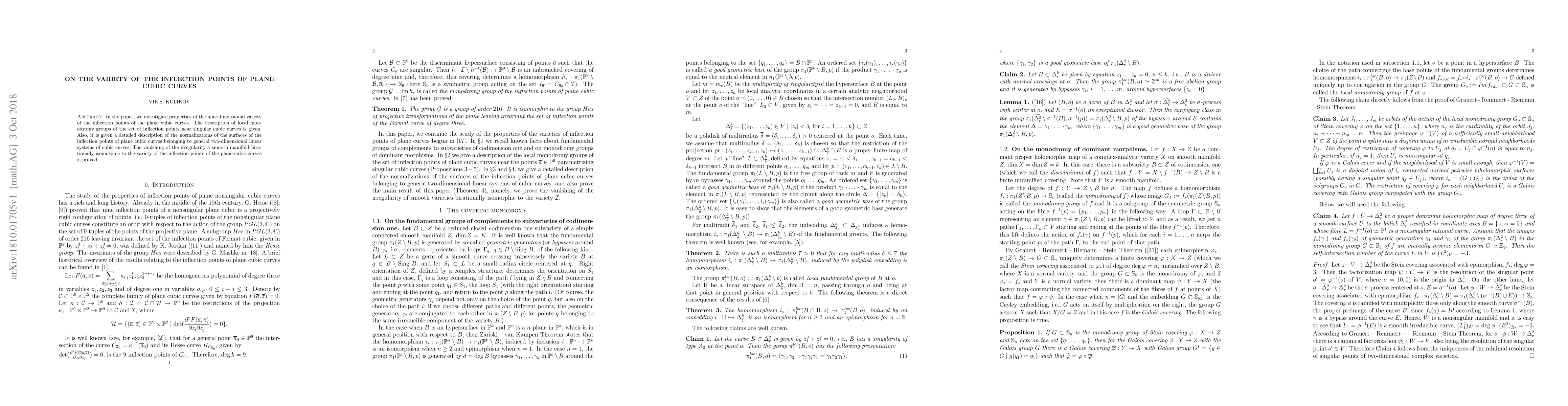 This paper explores the nine-dimensional variety of inflection points on plane cubic curves, detailing local monodromy groups near singular curves and normalizations of inflection point surfaces within general linear systems. It also proves the vanishing of the irregularity on a smooth manifold birationally isomorphic to the inflection point variety.