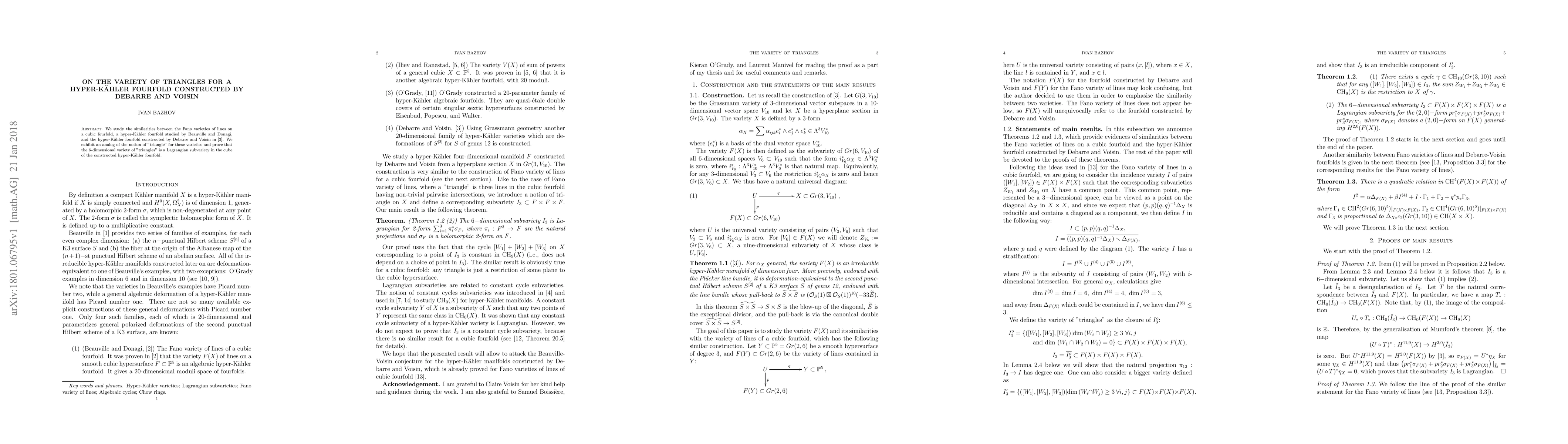 Summary: This paper explores the similarities between Fano varieties of lines on different fourfolds, including a hyper-Kaehler fourfold by Debarre and Voisin, and establishes an analog of the "triangle" concept, proving that the 6-dimensional variety of these triangles forms a Lagrangian subvariety within the cube of the constructed hyper-Kaehler fourfold.