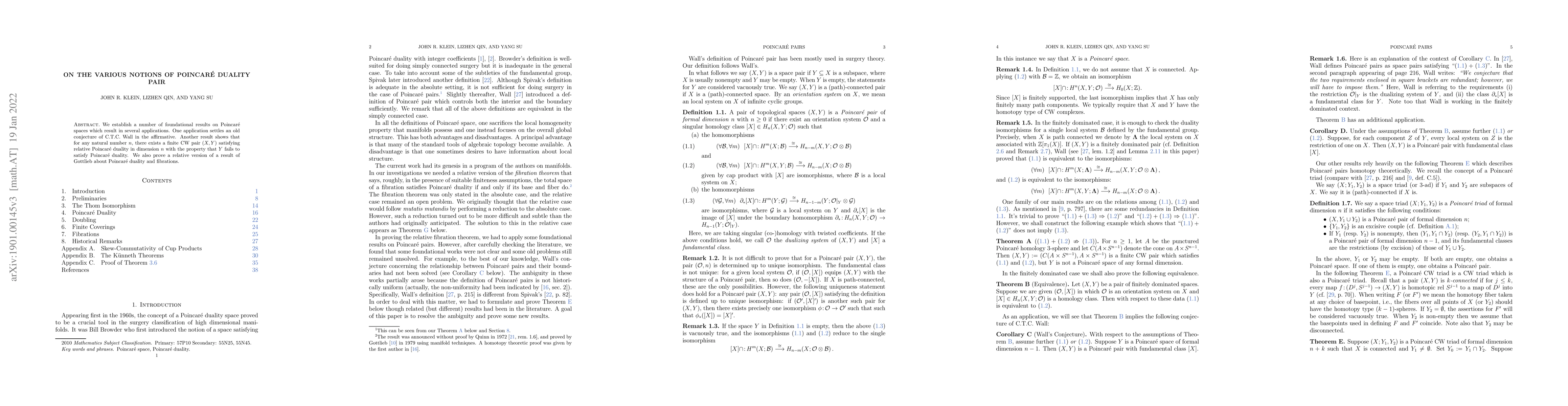 We establish a number of foundational results on Poincar\'e spaces which result in several applications. One application settles an old conjecture of C.T.C. Wall in the affirmative. Another result shows that for any natural number n, there exists a finite CW pair $(X,Y)$ satisfying relative Poincar\'e duality in dimension n with the property that $Y$ fails to satisfy Poincar\'e duality. We also prove a relative version of a result of Gottlieb about Poincar\'e duality and fibrations.