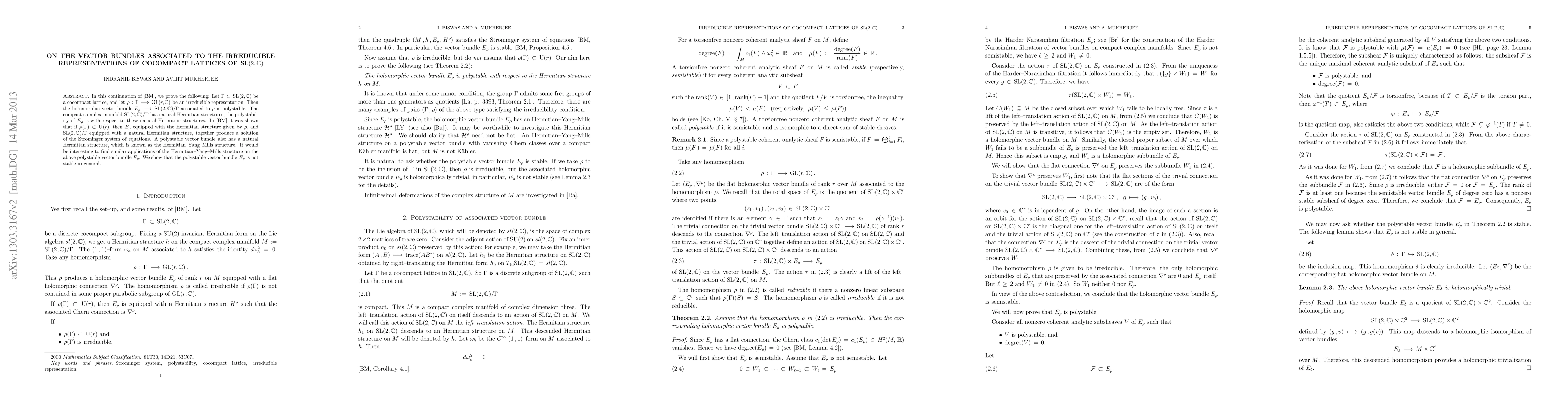 A research paper proves that for cocompact lattices of SL(2,C) and irreducible representations, the associated vector bundle is polystable with respect to natural Hermitian structures on the quotient manifold.