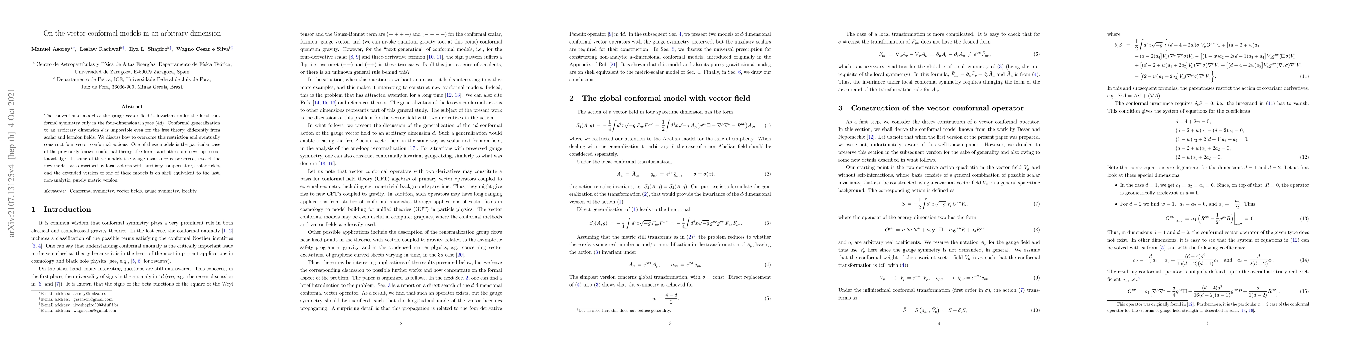 This paper explores the construction of vector conformal models in arbitrary dimensions, addressing the challenge of extending conformal invariance beyond four dimensions. It presents new vector conformal actions, some preserving gauge invariance, and introduces auxiliary scalar fields to construct local actions.
