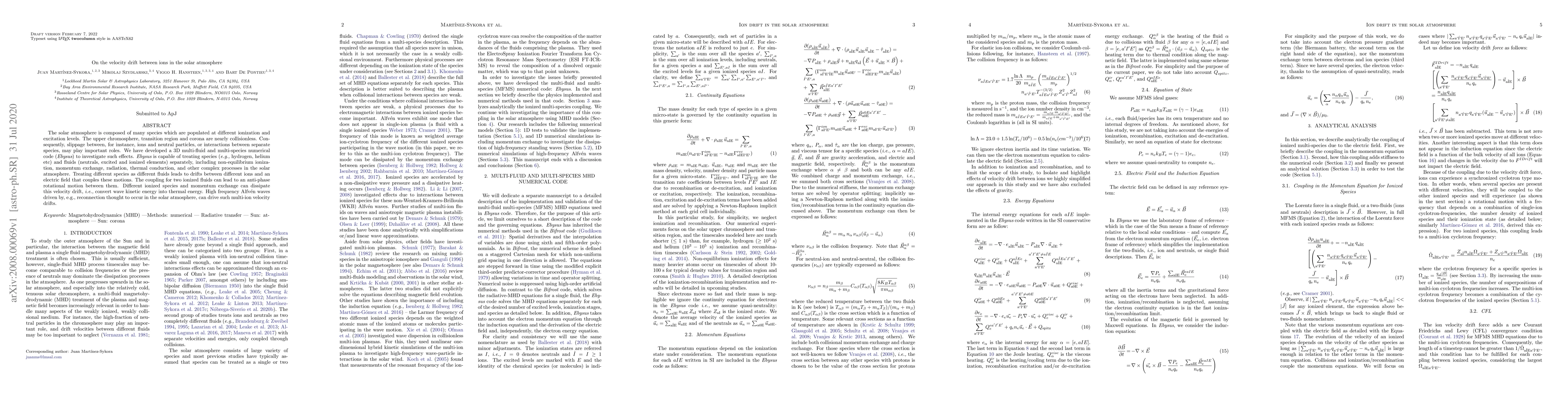 The solar atmosphere is composed of many species which are populated at different ionization and excitation levels. The upper chromosphere, transition region, and corona are nearly collisionless. Consequently, slippage between, for instance, ions and neutral particles, or interactions between separate species, may play important roles. We have developed a 3D multi-fluid and multi-species numerical code (Ebysus) to investigate such effects. Ebysus is capable of treating species (e.g., hydrogen, helium, etc) and fluids (neutrals, excited and ionized elements) separately, including non-equilibrium ionization, momentum exchange, radiation, thermal conduction, and other complex processes in the solar atmosphere. Treating different species as different fluids leads to drifts between different ions and an electric field that couples these motions. The coupling for two ionized fluids can lead to an anti-phase rotational motion between them. Different ionized species and momentum exchange can dissipate this velocity drift, i.e., convert wave kinetic energy into thermal energy. High frequency Alfv\'en waves driven by, e.g., reconnection thought to occur in the solar atmosphere, can drive such multi-ion velocity drifts.