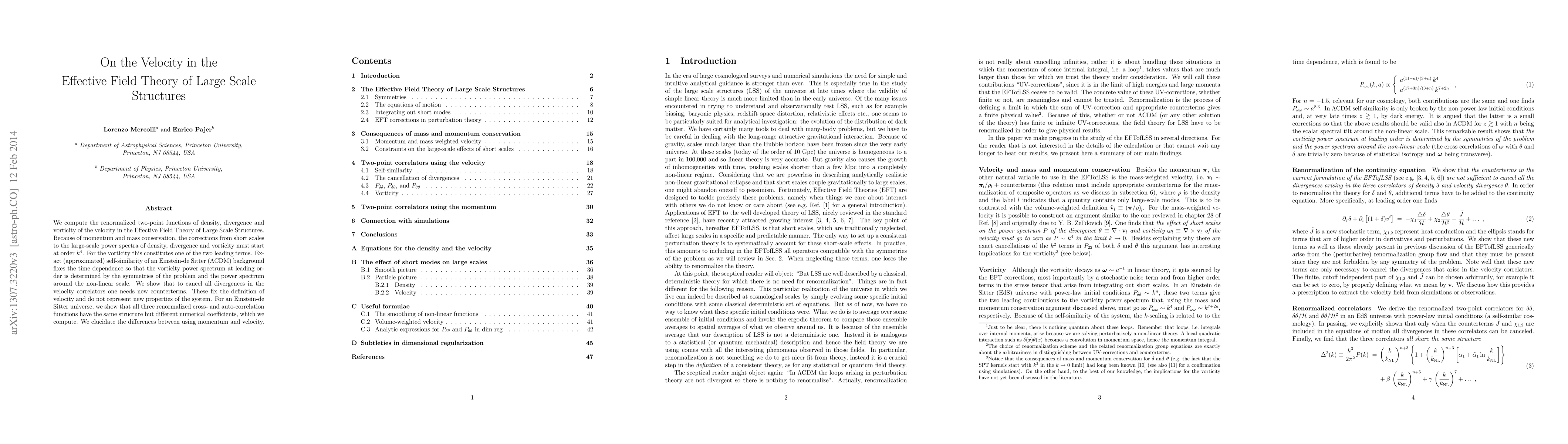We compute the renormalized two-point functions of density, divergence and vorticity of the velocity in the Effective Field Theory of Large Scale Structures. Because of momentum and mass conservation, the corrections from short scales to the large-scale power spectra of density, divergence and vorticity must start at order $k^{4}$. For the vorticity this constitutes one of the two leading terms. Exact (approximated) self-similarity of an Einstein-de Sitter ($\Lambda$CDM) background fixes the time dependence so that the vorticity power spectrum at leading order is determined by the symmetries of the problem and the power spectrum around the non-linear scale. We show that to cancel all divergences in the velocity correlators one needs new counterterms. These fix the definition of velocity and do not represent new properties of the system. For an Einstein-de Sitter universe, we show that all three renormalized cross- and auto-correlation functions have the same structure but different numerical coefficients, which we compute. We elucidate the differences between using momentum and velocity.
