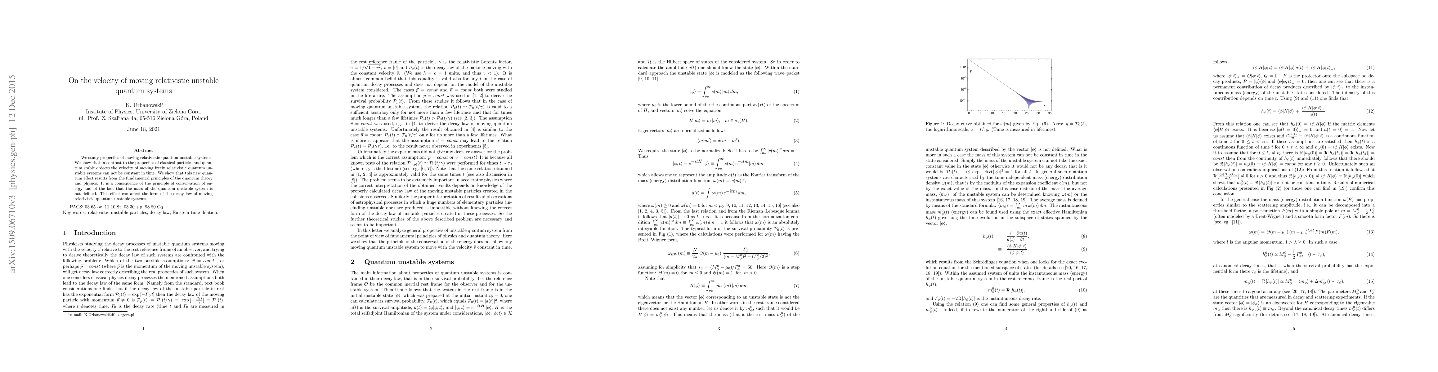 This paper investigates the velocity of relativistic quantum unstable systems, demonstrating that unlike classical particles, their velocity cannot remain constant due to quantum effects stemming from the conservation of energy and undefined mass, potentially altering the decay law.