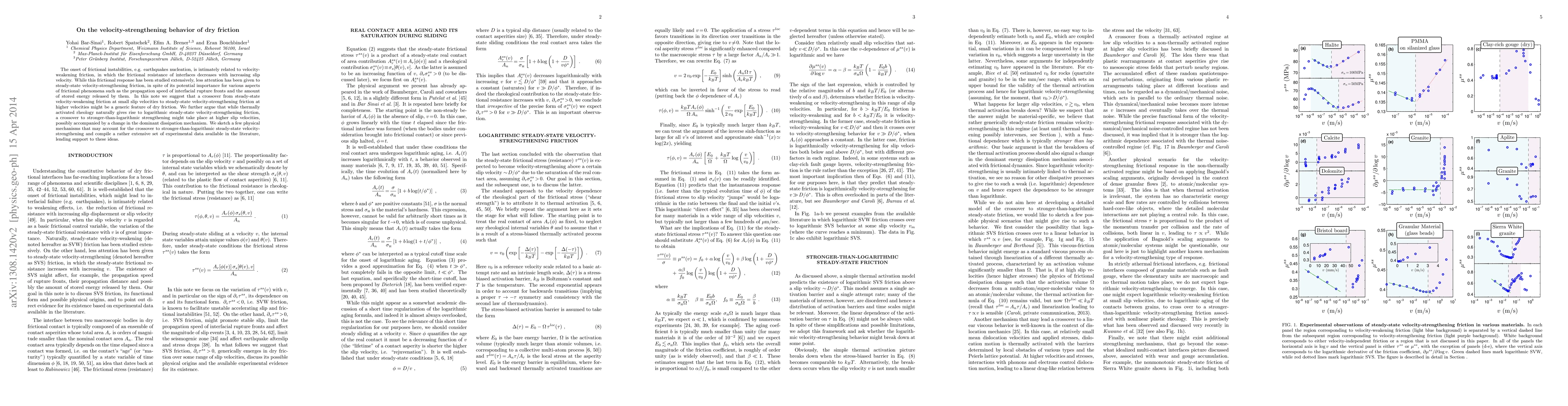 This paper explores the transition from velocity-weakening to velocity-strengthening friction in dry interfaces, suggesting that this crossover is a common feature. It posits that stronger-than-logarithmic velocity-strengthening friction may occur at higher slip velocities due to changes in the dominant dissipation mechanism, supported by experimental data.