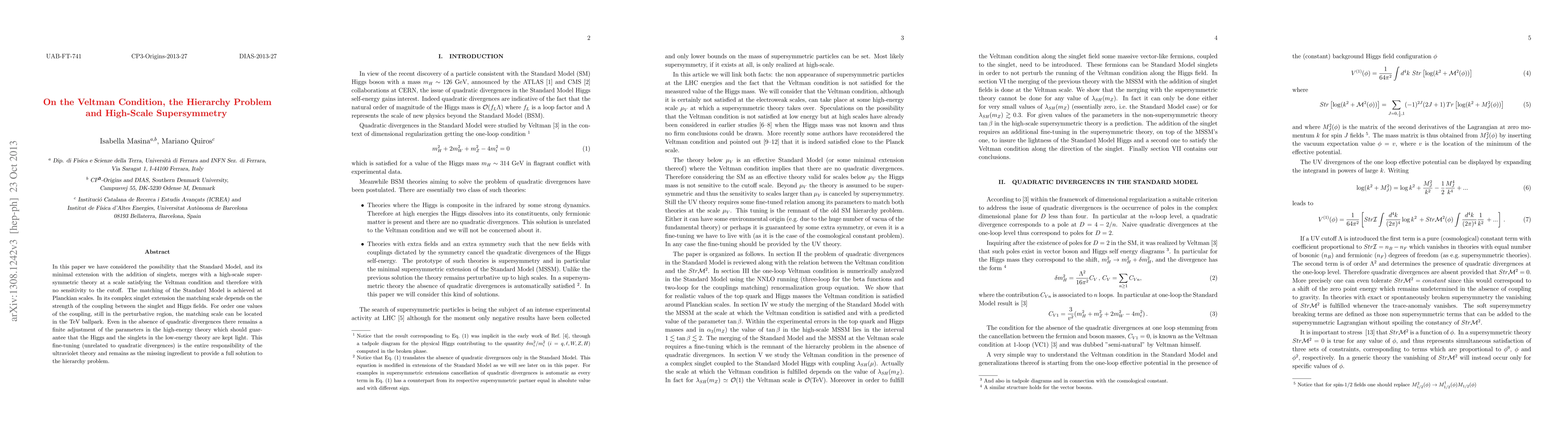 In this paper we have considered the possibility that the Standard Model, and its minimal extension with the addition of singlets, merges with a high-scale supersymmetric theory at a scale satisfying the Veltman condition and therefore with no sensitivity to the cutoff. The matching of the Standard Model is achieved at Planckian scales. In its complex singlet extension the matching scale depends on the strength of the coupling between the singlet and Higgs fields. For order one values of the coupling, still in the perturbative region, the matching scale can be located in the TeV ballpark. Even in the absence of quadratic divergences there remains a finite adjustment of the parameters in the high-energy theory which should guarantee that the Higgs and the singlets in the low-energy theory are kept light. This fine-tuning (unrelated to quadratic divergences) is the entire responsibility of the ultraviolet theory and remains as the missing ingredient to provide a full solution to the hierarchy problem.