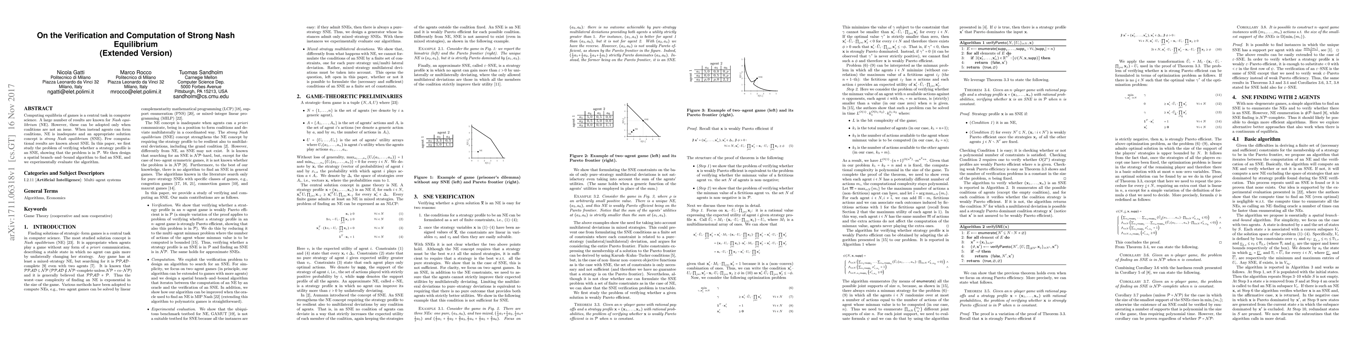 Computing equilibria of games is a central task in computer science. A large number of results are known for \emph{Nash equilibrium} (NE). However, these can be adopted only when coalitions are not an issue. When instead agents can form coalitions, NE is inadequate and an appropriate solution concept is \emph{strong Nash equilibrium} (SNE). Few computational results are known about SNE. In this paper, we first study the problem of verifying whether a strategy profile is an SNE, showing that the problem is in $\mathcal{P}$. We then design a spatial branch--and--bound algorithm to find an SNE, and we experimentally evaluate the algorithm.