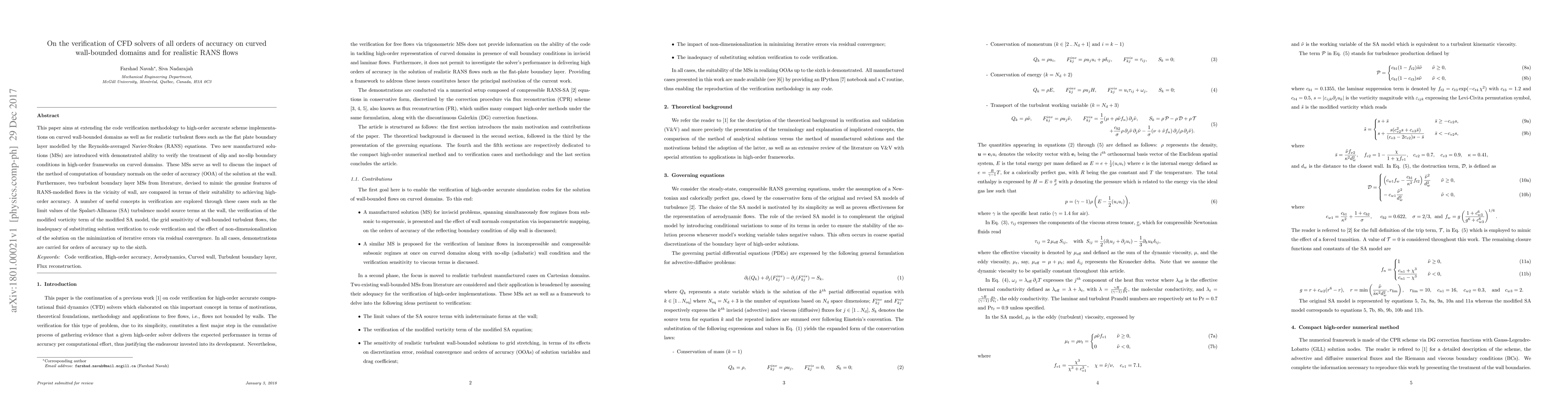 This paper aims at extending the code verification methodology to high-order accurate scheme implementations on curved wall-bounded domains as well as for realistic turbulent flows such as the flat plate boundary layer modelled by the Reynolds-averaged Navier-Stokes (RANS) equations. Two new manufactured solutions (MSs) are introduced with demonstrated ability to verify the treatment of slip and no-slip boundary conditions in high-order frameworks on curved domains. These MSs serve as well to discuss the impact of the method of computation of boundary normals on the order of accuracy (OOA) of the solution at the wall. Furthermore, two turbulent boundary layer MSs from literature, devised to mimic the genuine features of RANS-modelled flows in the vicinity of wall, are compared in terms of their suitability to achieving high-order accuracy. A number of useful concepts in verification are explored through these cases such as the limit values of the Spalart-Allmaras (SA) turbulence model source terms at the wall, the verification of the modified vorticity term of the modified SA model, the grid sensitivity of wall-bounded turbulent flows, the inadequacy of substituting solution verification to code verification and the effect of non-dimensionalization of the solution on the minimization of iterative errors via residual convergence. In all cases, demonstrations are carried for orders of accuracy up to the sixth.