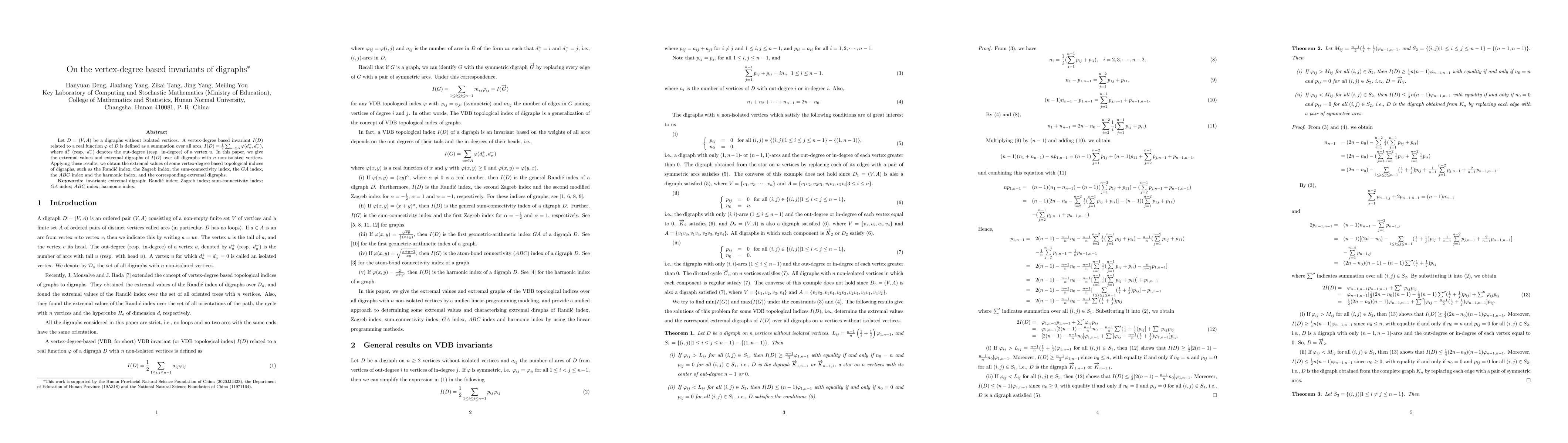 This paper defines a vertex-degree based invariant $I(D)$ for digraphs and determines its extremal values and corresponding digraphs for digraphs with $n$ non-isolated vertices. It also applies these results to derive extremal values for several topological indices of digraphs.