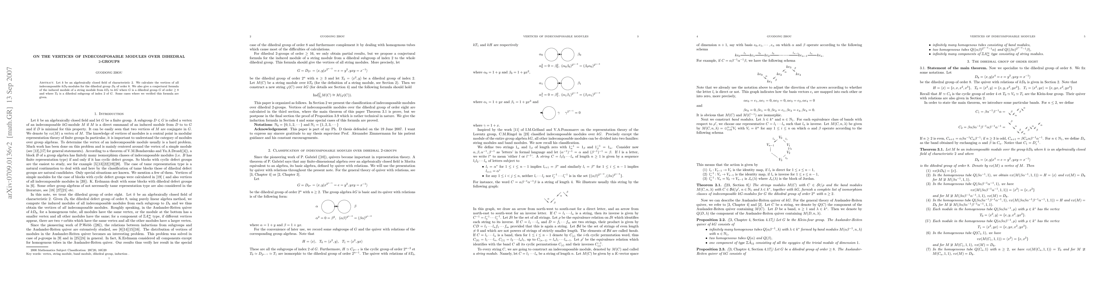 Let $k$ be an algebraically closed field of characteristic 2. We compute the vertices of all indecomposable $kD_8$-modules for the dihedral group $D_8$ of order 8. We also give a conjectural formula of the induced module of a string module from $kT_0$ to $kG$ where $G$ is a dihedral group of order $\geq 8$ and where $T_0$ is a dihedral subgroup of index 2 of $G$. Some cases where we verified this formula are given.