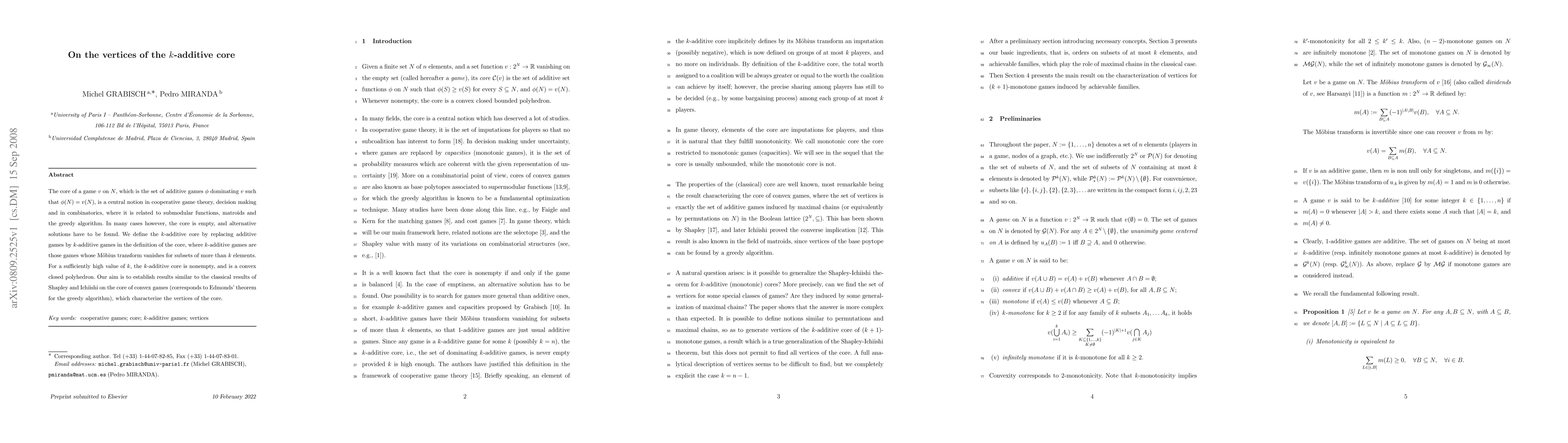 The core of a game $v$ on $N$, which is the set of additive games $\phi$ dominating $v$ such that $\phi(N)=v(N)$, is a central notion in cooperative game theory, decision making and in combinatorics, where it is related to submodular functions, matroids and the greedy algorithm. In many cases however, the core is empty, and alternative solutions have to be found. We define the $k$-additive core by replacing additive games by $k$-additive games in the definition of the core, where $k$-additive games are those games whose M\"obius transform vanishes for subsets of more than $k$ elements. For a sufficiently high value of $k$, the $k$-additive core is nonempty, and is a convex closed polyhedron. Our aim is to establish results similar to the classical results of Shapley and Ichiishi on the core of convex games (corresponds to Edmonds' theorem for the greedy algorithm), which characterize the vertices of the core.