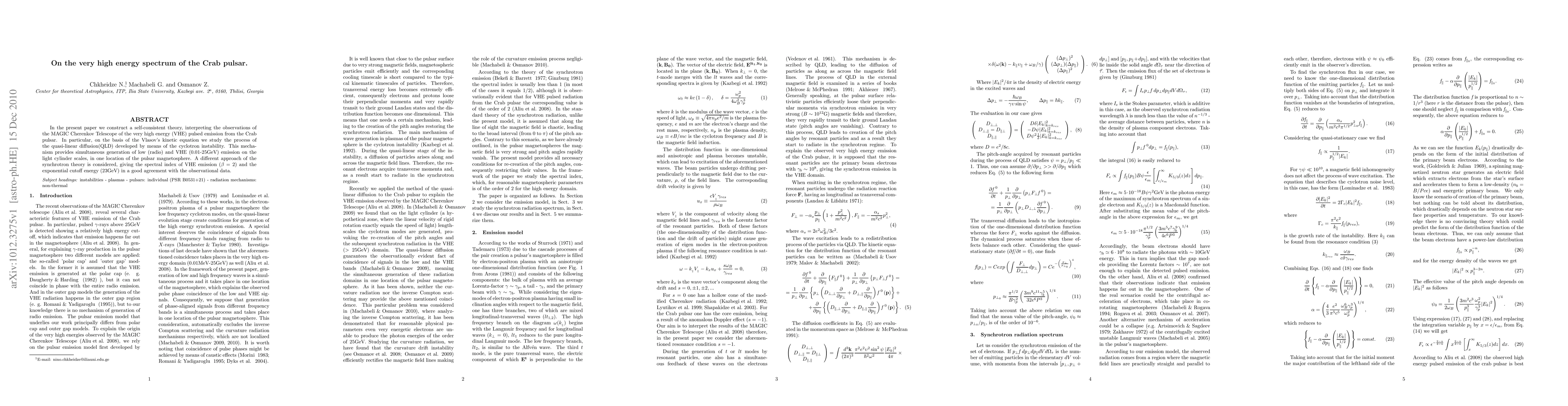 In the present paper we construct a self-consistent theory, interpreting the observations of the MAGIC Cherenkov Telescope of the very high energy (VHE) pulsed emission from the Crab pulsar. In particular, on the basis of the Vlasov's kinetic equation we study the process of the quasi-linear diffusion(QLD) developed by means of the cyclotron instability. This mechanism provides simultaneous generation of low (radio) and VHE (0.01-25GeV) emission on the light cylinder scales, in one location of the pulsar magnetosphere. A different approach of the synchrotron theory is considered, giving the spectral index of VHE emission ($\beta=2$) and the exponential cutoff energy (23 GeV) in a good agreement with the observational data.