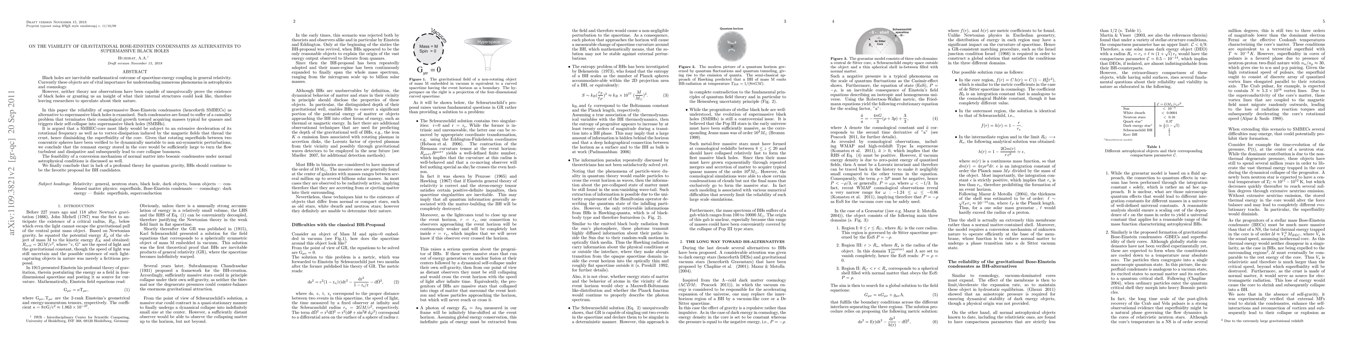 Black holes are inevitable mathematical outcome of spacetime-energy coupling in general relativity. Currently these objects are of vital importance for understanding numerous phenomena in astrophysics and cosmology. However, neither theory nor observations have been capable of unequivocally prove the existence of black holes or granting us an insight of what their internal structures could look like, therefore leaving researchers to speculate about their nature. In this paper the reliability of supermassive Bose-Einstein condensates (henceforth SMBECs) as alternative to supermassive black holes is examined. Such condensates are found to suffer of a causality problem that terminates their cosmological growth toward acquiring masses typical for quasars and triggers their self-collapse into supermassive black holes (SMBHs). It is argued that a SMBEC-core most likely would be subject to an extensive deceleration of its rotational frequency as well as to vortex-dissipation induced by the magnetic fields that thread the crust, hence diminishing the superfluidity of the core. Given that rotating superfluids between two concentric spheres have been verified to be dynamically unstable to non axi-symmetric perturbations, we conclude that the remnant energy stored in the core would be sufficiently large to turn the flow turbulent and dissipative and subsequently lead to core collapse bosonova. The feasibility of a conversion mechanism of normal matter into bosonic condensates under normal astrophysical conditions is discussed as well. We finally conclude that in lack of a profound theory for quantum gravity, BHs should continue to be the favorite proposal for BH candidates.