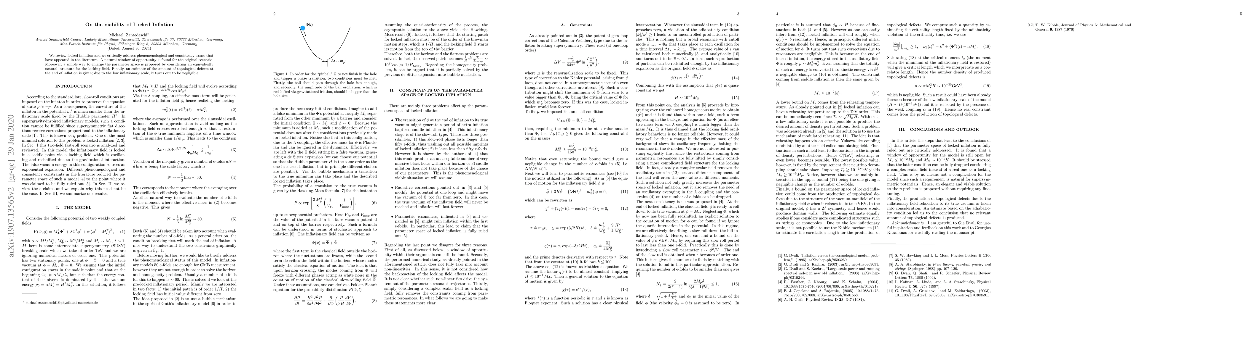 The paper critically examines locked inflation, identifying a favorable parameter range for the original scenario. It also suggests expanding this range by considering a naturally equivalent structure for the locking field. The study concludes that topological defects at the end of inflation would be negligible due to the low inflationary scale.