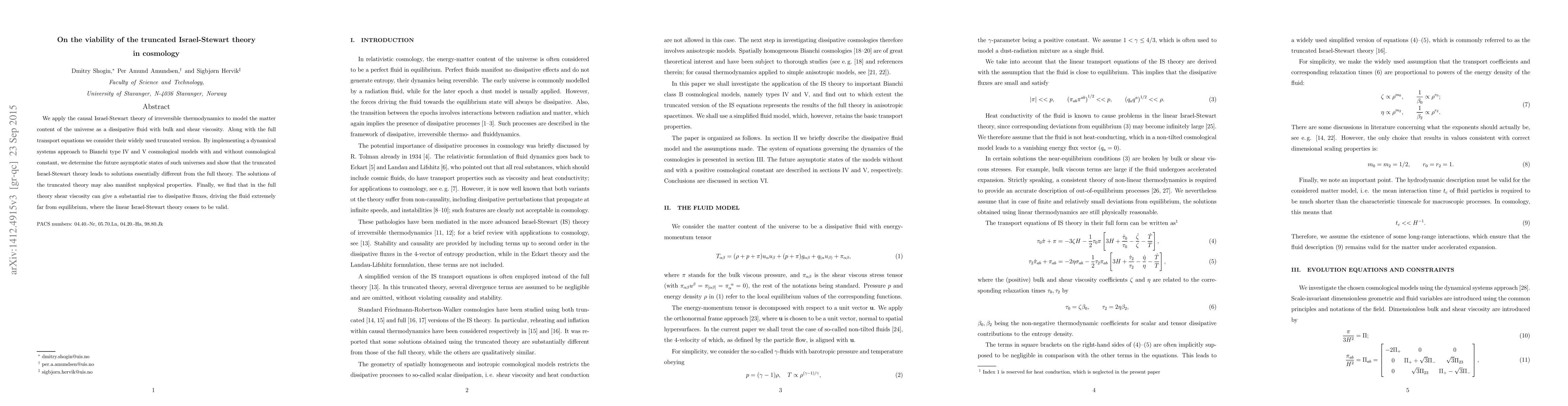 This paper examines the truncated Israel-Stewart theory for modeling dissipative fluids in cosmology, finding that it leads to solutions differing significantly from the full theory, potentially including unphysical properties, while the full theory shows shear viscosity can substantially drive the fluid far from equilibrium.
