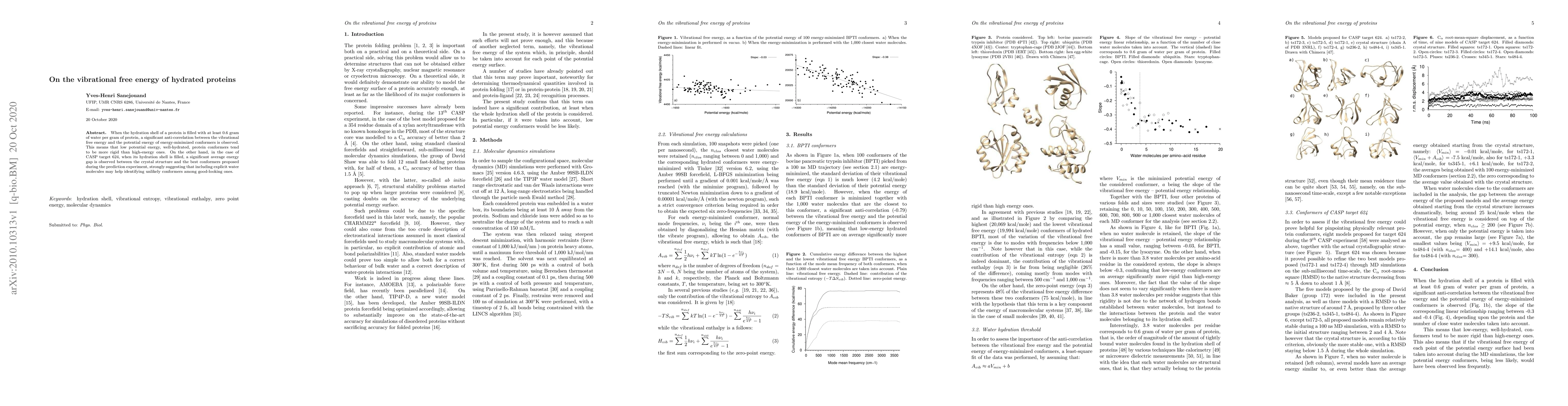 When the hydration shell of a protein is filled with at least 0.6 gram of water per gram of protein, a significant anti-correlation between the vibrational free energy and the potential energy of energy-minimized conformers is observed. This means that low potential energy, well-hydrated, protein conformers tend to be more rigid than high-energy ones. On the other hand, in the case of CASP target 624, when its hydration shell is filled, a significant average energy gap is observed between the crystal structure and the best conformers proposed during the prediction experiment, strongly suggesting that including explicit water molecules may help identifying unlikely conformers among good-looking ones.