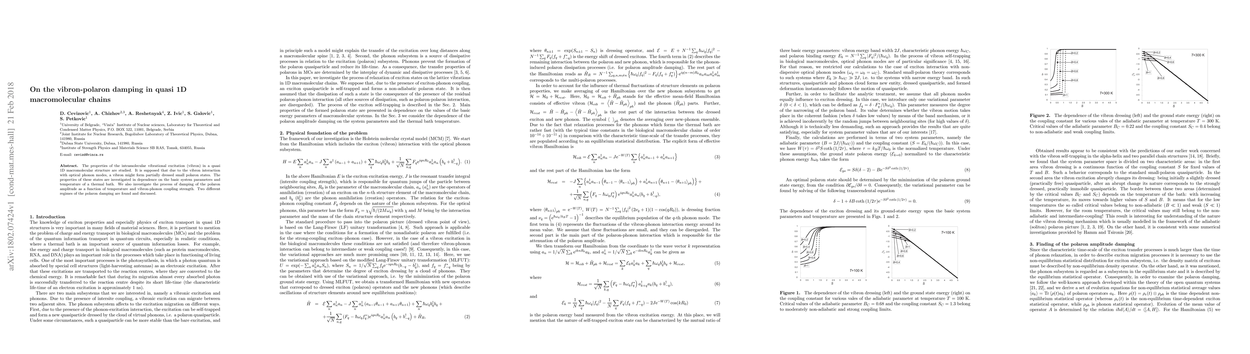 The properties of the intramolecular vibrational excitation (vibron) in a quasi 1D macromolecular structure are studied. It is supposed that due to the vibron interaction with optical phonon modes, a vibron might form partially dressed small polaron states. The properties of these states are investigated in dependence on the basic system parameters and temperature of a thermal bath. We also investigate the process of damping of the polaron amplitude as a function of temperature and vibron-phonon coupling strength. Two different regimes of the polaron damping are found and discussed.
