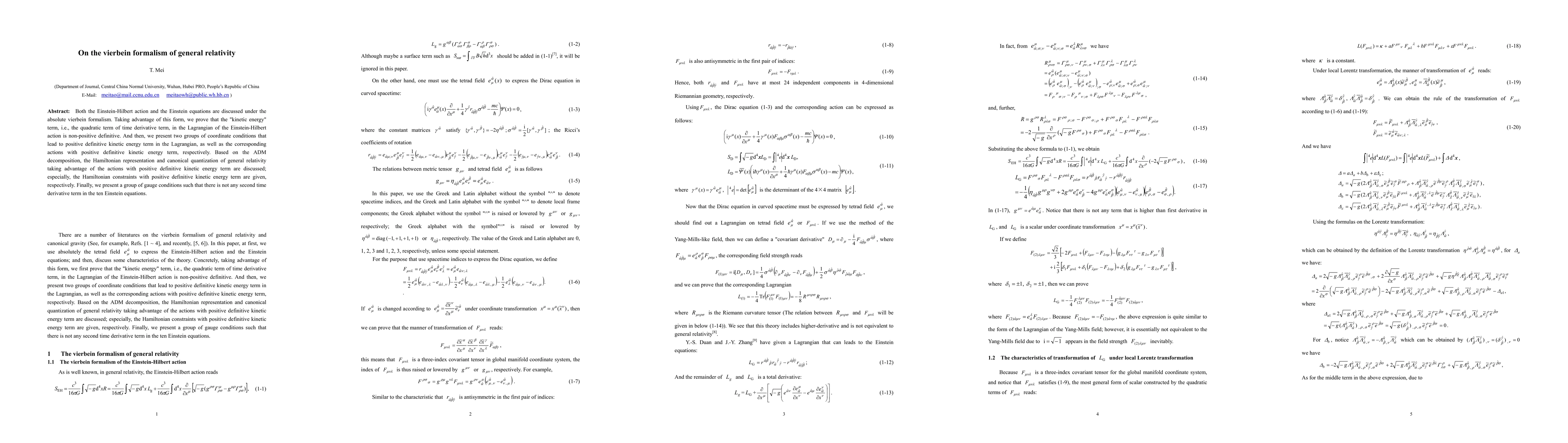 Both the Einstein-Hilbert action and the Einstein equations are discussed under the absolute vierbein formalism. Taking advantage of this form, we prove that the "kinetic energy" term, i.e., the quadratic term of time derivative term, in the Lagrangian of the Einstein-Hilbert action is non-positive definitive. And then, we present two groups of coordinate conditions that lead to positive definitive kinetic energy term in the Lagrangian, as well as the corresponding actions with positive definitive kinetic energy term, respectively. Based on the ADM decomposition, the Hamiltonian representation and canonical quantization of general relativity taking advantage of the actions with positive definitive kinetic energy term are discussed; especially, the Hamiltonian constraints with positive definitive kinetic energy term are given, respectively. Finally, we present a group of gauge conditions such that there is not any second time derivative term in the ten Einstein equations.