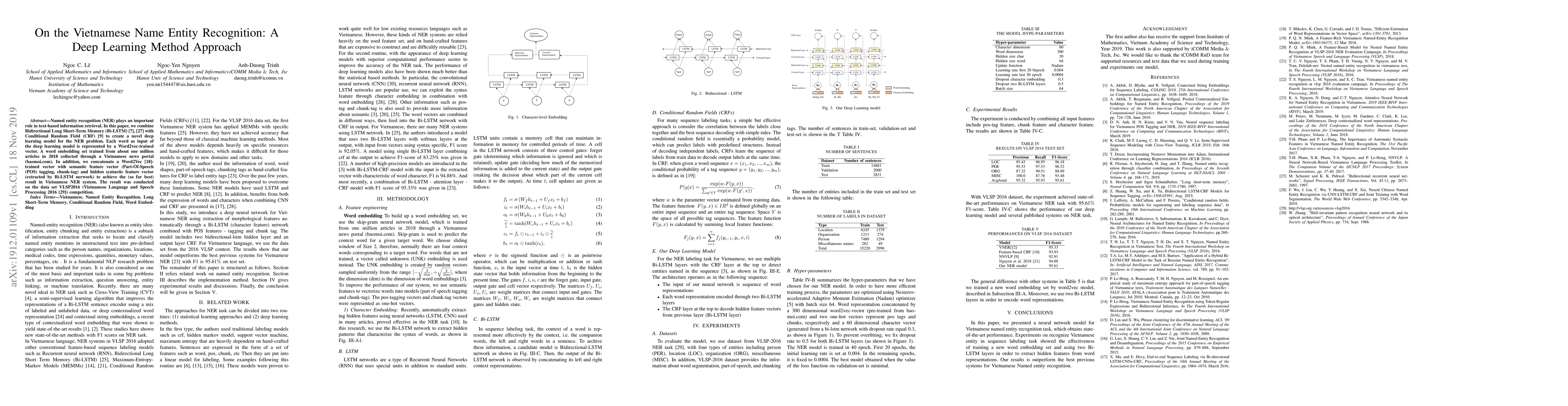 This paper proposes a novel deep learning model for Vietnamese Name Entity Recognition that combines Bidirectional Long Short-Term Memory (Bi-LSTM) with Conditional Random Field (CRF), achieving the best result in Vietnamese NER system to date.