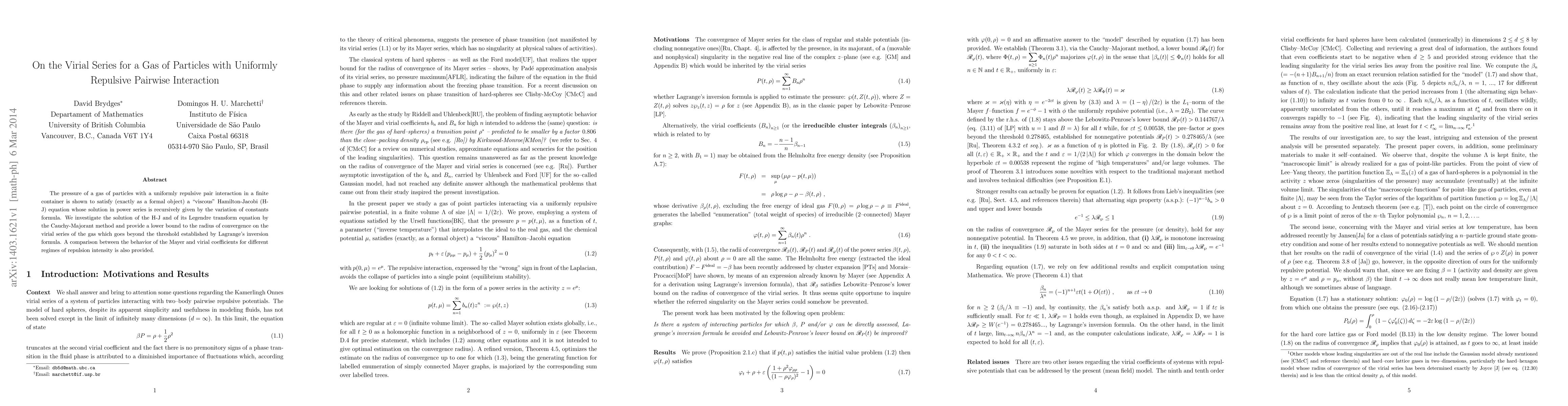 This paper demonstrates that the pressure of a gas with uniformly repulsive pairwise interactions satisfies a "viscous" Hamilton-Jacobi equation, providing a recursive power series solution via the variation of constants formula. It also explores the Cauchy-Majorant method for solving the associated equations and establishes a lower bound for the virial series convergence radius.