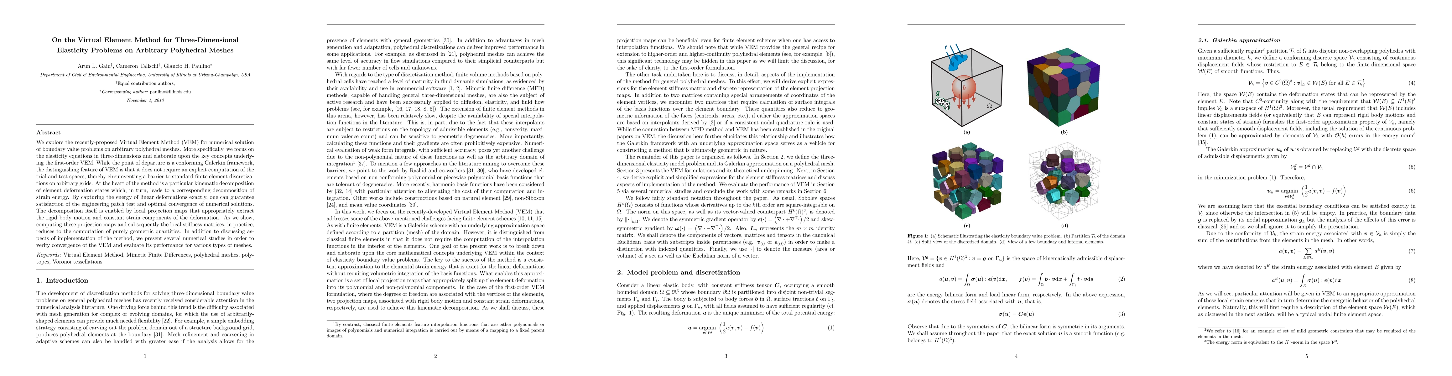 This paper investigates the Virtual Element Method (VEM) for solving three-dimensional elasticity problems on arbitrary polyhedral meshes, highlighting its ability to avoid explicit computation of trial and test spaces. The method achieves exact linear deformation energy capture and optimal convergence through a kinematic decomposition and local projection maps, which are computed from geometric quantities.