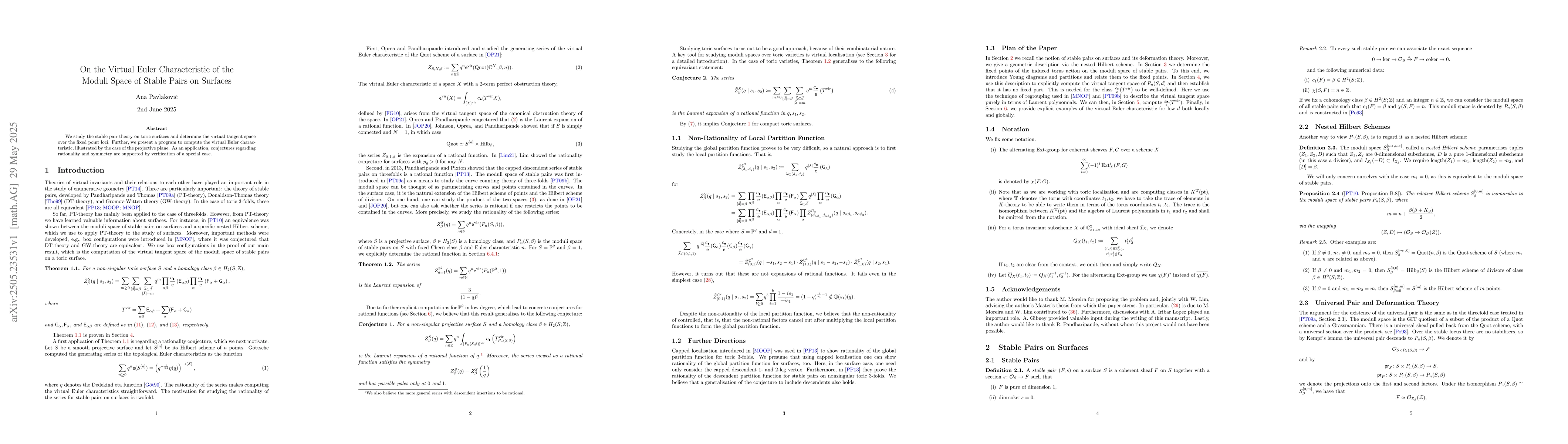 The research methodology involves studying stable pair theory on toric surfaces, determining the virtual tangent space over fixed point loci, and presenting a computation program for the virtual Euler characteristic, exemplified by the projective plane case.