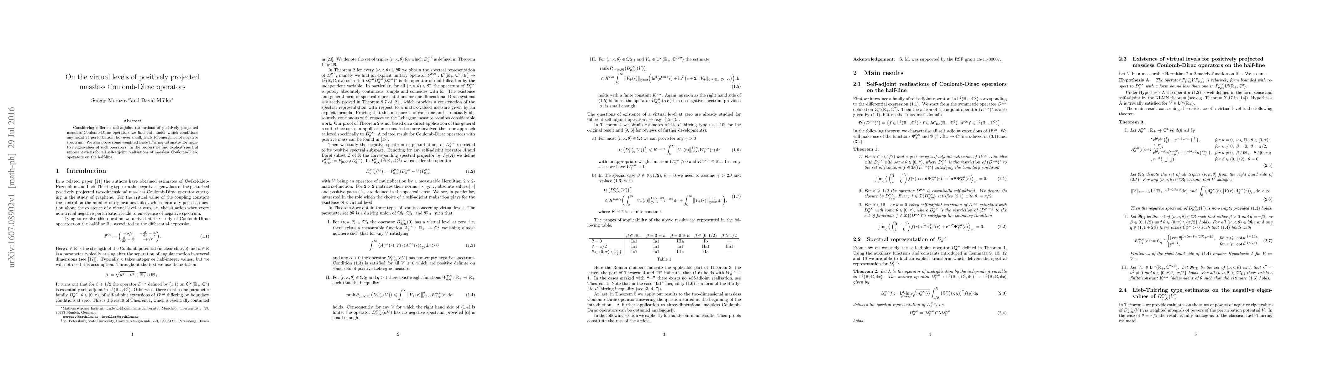 This paper investigates self-adjoint realizations of positively projected massless Coulomb-Dirac operators, revealing conditions under which small perturbations can induce negative spectra. It also establishes weighted Lieb-Thirring estimates for negative eigenvalues and provides explicit spectral representations for these operators on the half-line.
