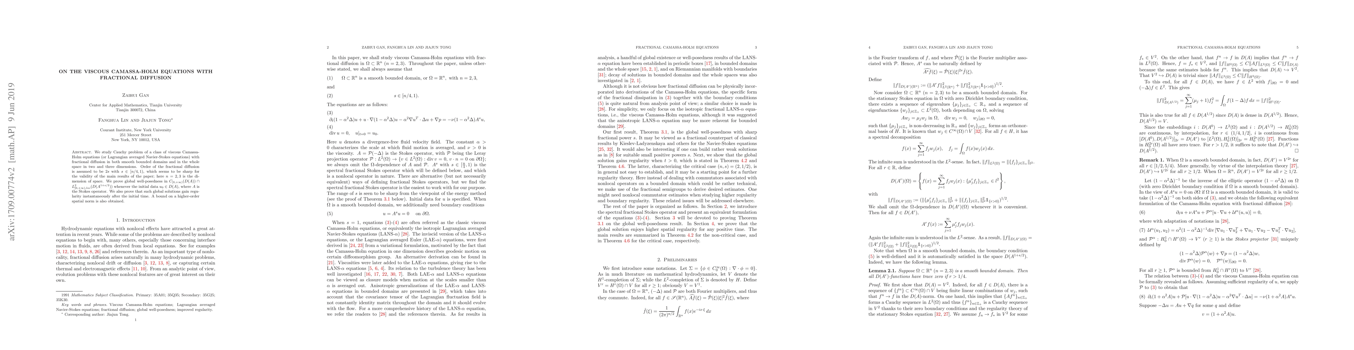 We study Cauchy problem of a class of viscous Camassa-Holm equations (or Lagrangian averaged Navier-Stokes equations) with fractional diffusion in both smooth bounded domains and in the whole space in two and three dimensions. Order of the fractional diffusion is assumed to be $2s$ with $s\in [n/4,1)$, which seems to be sharp for the validity of the main results of the paper; here $n=2,3$ is the dimension of space. We prove global well-posedness in $C_{[0,+\infty)}(D(A))\cap L^2_{[0,+\infty),loc}(D(A^{1+s/2}))$ whenever the initial data $u_0\in D(A)$, where $A$ is the Stokes operator. We also prove that such global solutions gain regularity instantaneously after the initial time. A bound on a higher-order spatial norm is also obtained.
