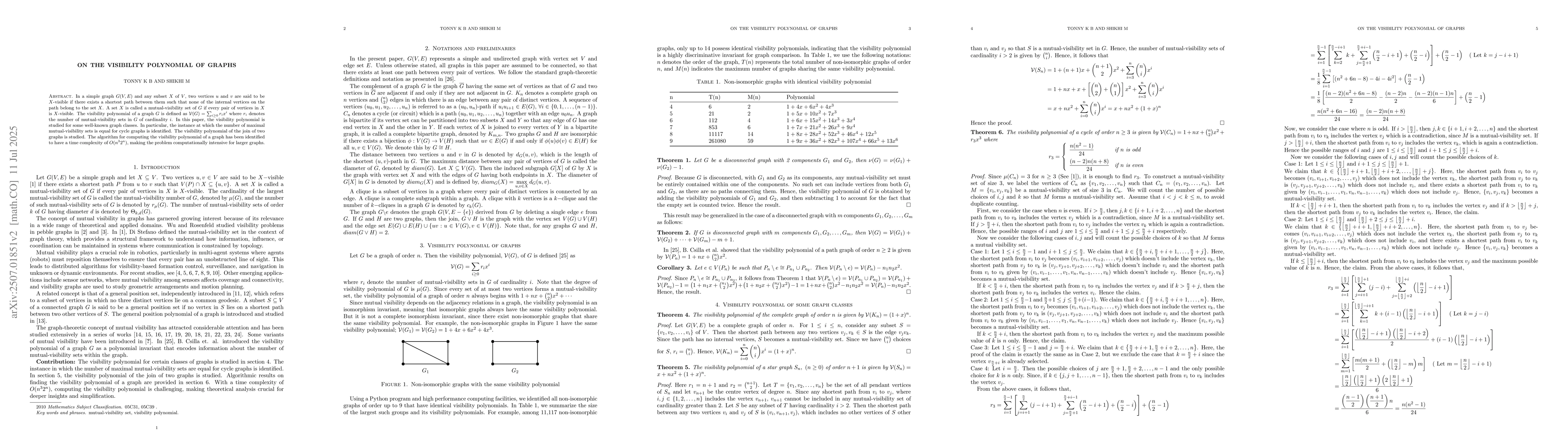 Let G(V,E) be a simple graph and let X subset of V. Two vertices u and v are said to be X-visible if there exists a shortest u,v-path P such that V(P) intersection X is a subset of {u, v}. A set X is called a mutual-visibility set of G if every pair of vertices in X are X-visible. The visibility polynomial of a graph G is defined as nu (G)=sum_{i >= 0} r_i x^i, where r_i denotes the number of mutual-visibility sets in G of cardinality i. In the present paper, the visibility polynomial is studied for some well-known classes of graphs. In particular, the instance at which the number of maximal mutual-visibility sets is equal for cycle graphs is identified. The visibility polynomial of the join of two graphs is studied. The algorithm for computing the visibility polynomial of a graph has been identified to have a time complexity of O(n^3.2^n) making the problem computationally intensive for larger graphs.