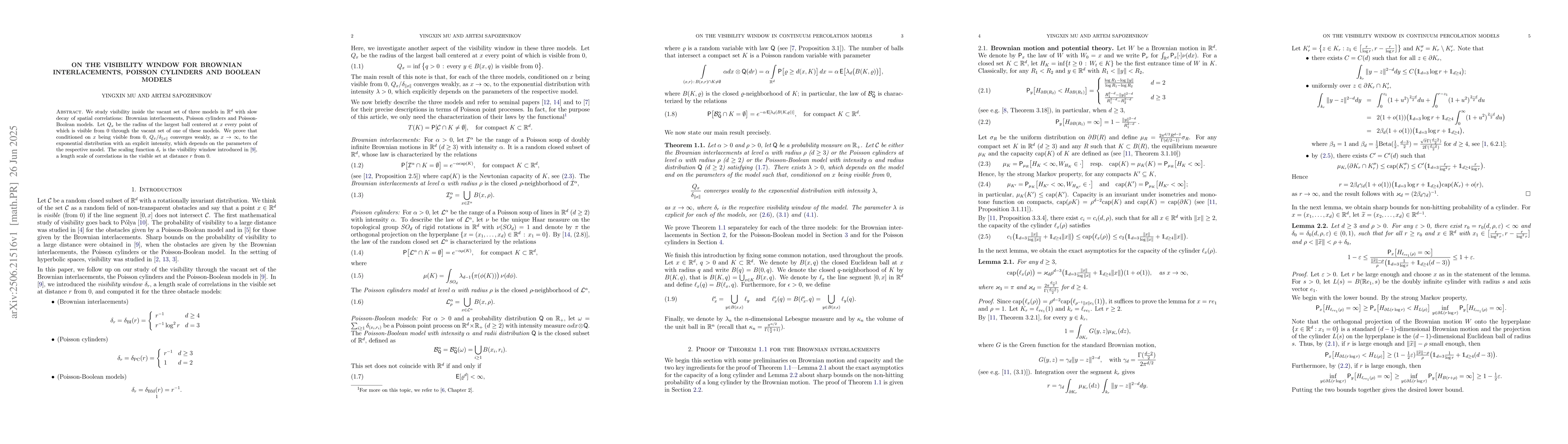 It introduces the concept of the visibility window in the context of Brownian interlacements, Poisson cylinders, and Boolean models, and characterizes the weak convergence of scaled visibility radii with explicit limiting distributions.