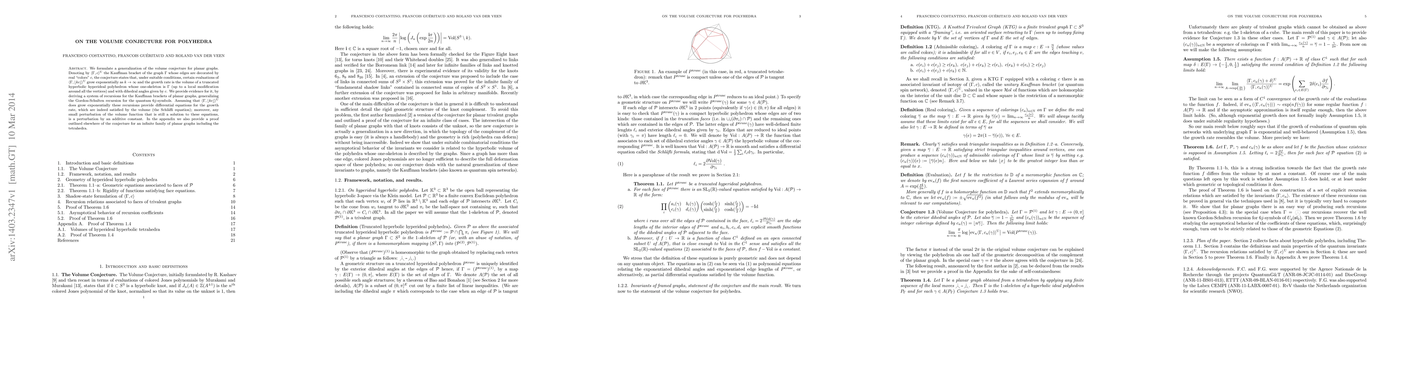 This paper generalizes the volume conjecture for planar graphs, proposing that the exponential growth rate of certain evaluations of the Kauffman bracket corresponds to the volume of a truncated hyperbolic hyperideal polyhedron. Evidence is provided through derived recursions for the Kauffman brackets and differential equations satisfied by the volume function.
