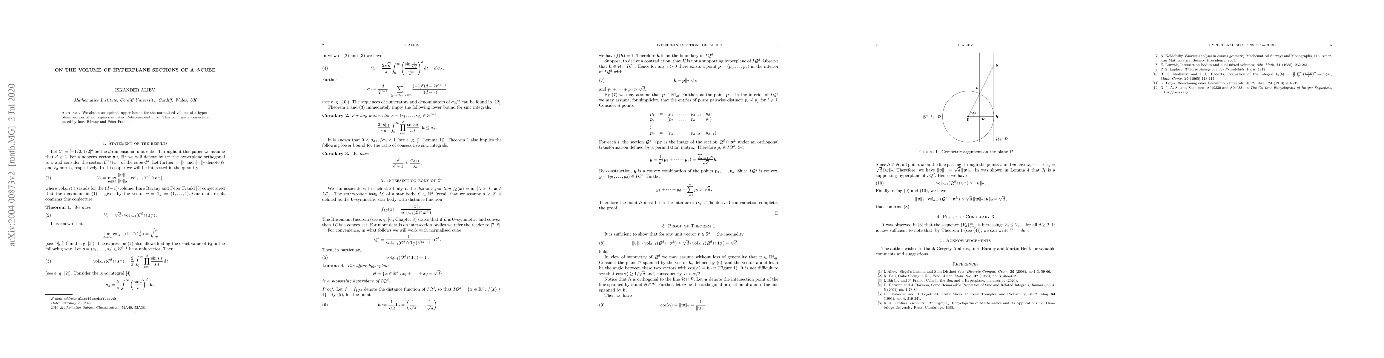 Summary: This paper provides an optimal upper bound for the normalized volume of hyperplane sections of a d-dimensional cube, confirming a conjecture by Imre Barany and Peter Frankl. The result offers a precise mathematical solution to the problem.