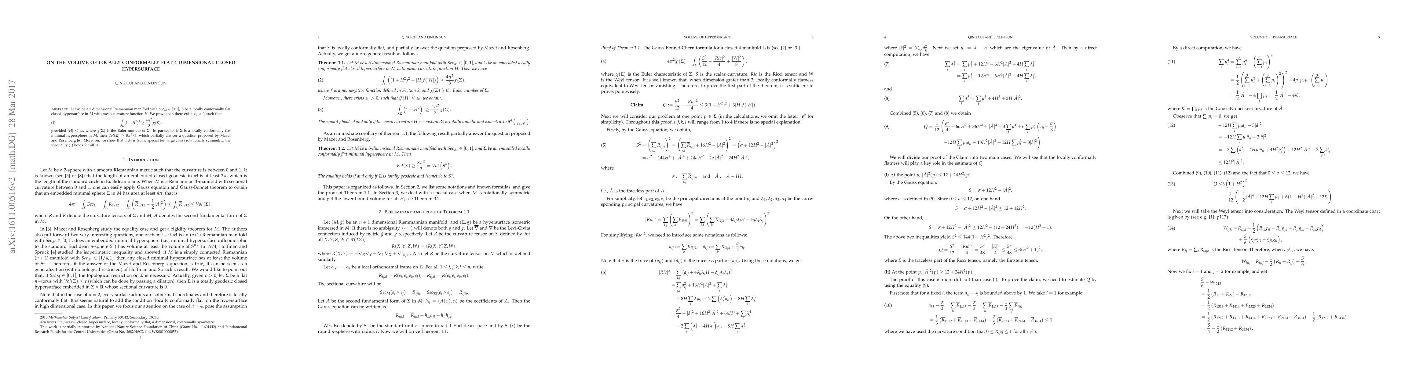 Let $M$ be a 5 dimensional Riemannian manifold with $Sec_M\in[0,1]$, $\Sigma$ be a locally conformally flat hypersphere in $M$ with mean curvature $H$. We prove that, there exists $\varepsilon_0>0$, such that $\int_\Sigma (1+H^2)^2 \ge 8\pi^2/3$, provided $H \le \varepsilon_0$. In particular, if $\Sigma$ is a locally conformally flat minimal hypersphere in $M$, then $Vol(\Sigma) \ge 8\pi^2/3$, which partially answer a question proposed by Mazet and Rosenberg \cite{Ma&Rosen}. For an $(n+1)-$ dimensional rotationally symmetric Riemannian manifold $M$, we show that an immersed hypersurface $\Sigma$ is locally conformally flat if and only if ($n-1$) of the principal curvatures of $\Sigma$ are the same, which is a generalization of Cartan's result \cite{Cartan}. As an application, we prove that if $M$ is (some special but large class) rotationally symmetric 5-manifold with $Sec_M\in [0,1]$, and $\Sigma$ is a locally conformally flat hypersphere with mean curvature $H$, the inequality $\int_\Sigma (1+H^2)^2 \ge 8\pi^2/3$ holds for all $H$.