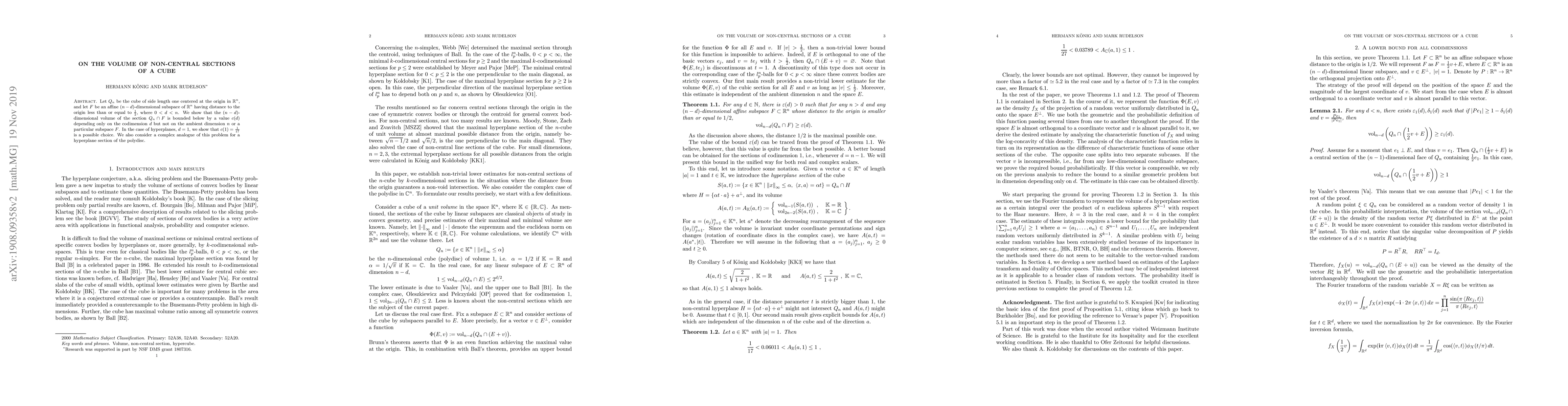 This paper investigates the lower bound of the $(n-d)$-dimensional volume of non-central sections of a unit cube in $\mathbb{R}^n$, showing it depends only on the codimension $d$. For $d=1$ (hyperplanes), it finds a specific lower bound value of $\frac{1}{17}$. It also explores a complex analogue for sections of a polydisc.