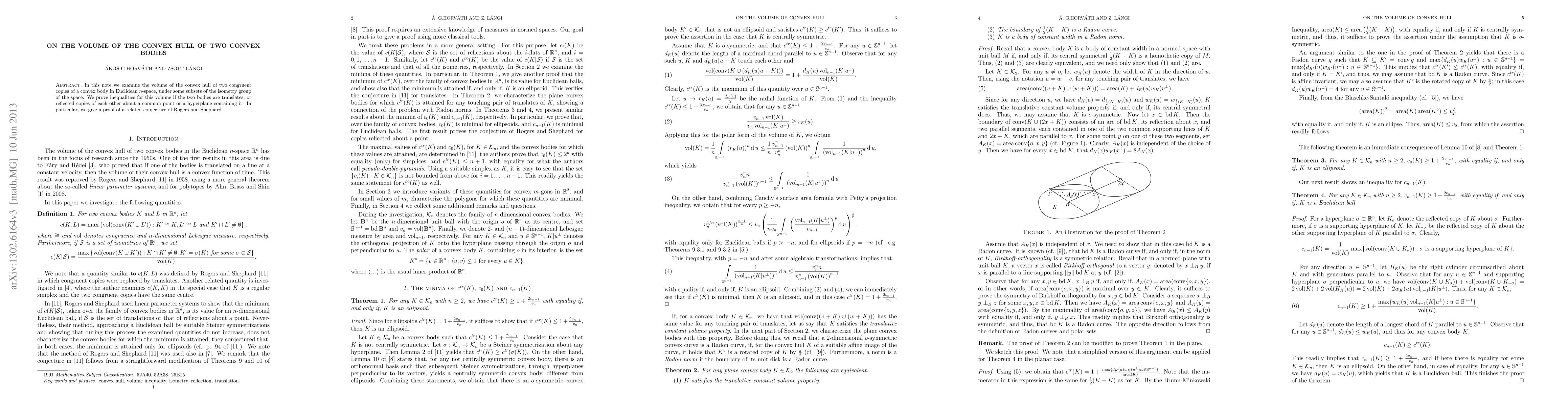 In this note we examine the volume of the convex hull of two congruent copies of a convex body in Euclidean $n$-space, under some subsets of the isometry group of the space. We prove inequalities for this volume if the two bodies are translates, or reflected copies of each other about a common point or a hyperplane containing it. In particular, we give a proof of a related conjecture of Rogers and Shephard.