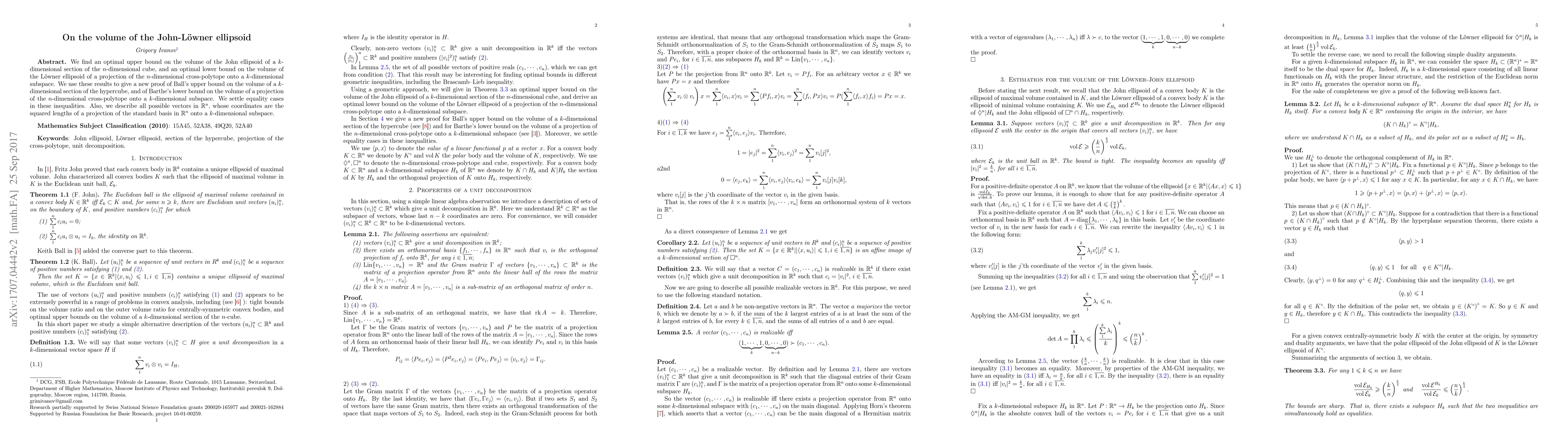 We find an optimal upper bound on the volume of the John ellipsoid of a $k$-dimensional section of the $n$-dimensional cube, and an optimal lower bound on the volume of the L\"owner ellipsoid of a projection of the $n$-dimensional cross-polytope onto a $k$-dimensional subspace. We use these results to give a new proof of Ball's upper bound on the volume of a $k$-dimensional section of the hypercube, and of Barthe's lower bound on the volume of a projection of the $n$-dimensional cross-polytope onto a $k$-dimensional subspace. We settle equality cases in these inequalities. Also, we describe all possible vectors in $\R^n,$ whose coordinates are the squared lengths of a projection of the standard basis in $\R^n$ onto a $k$-dimensional subspace.