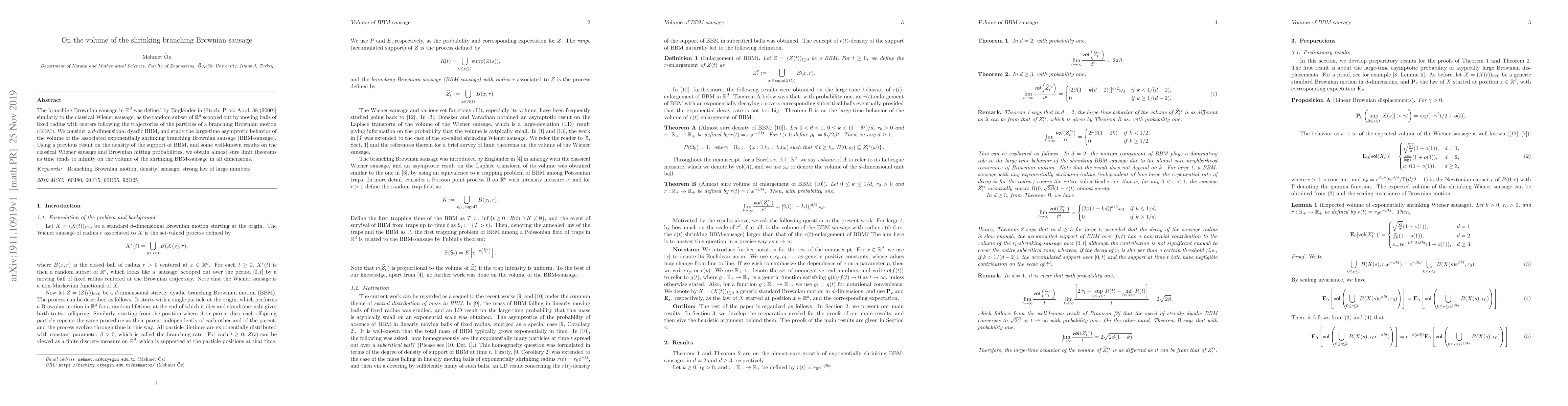 This research derives almost sure limit theorems for the volume of a shrinking, dyadic-dimensional branching Brownian motion sausage as time approaches infinity, using prior results on BBM density and Wiener sausage properties.