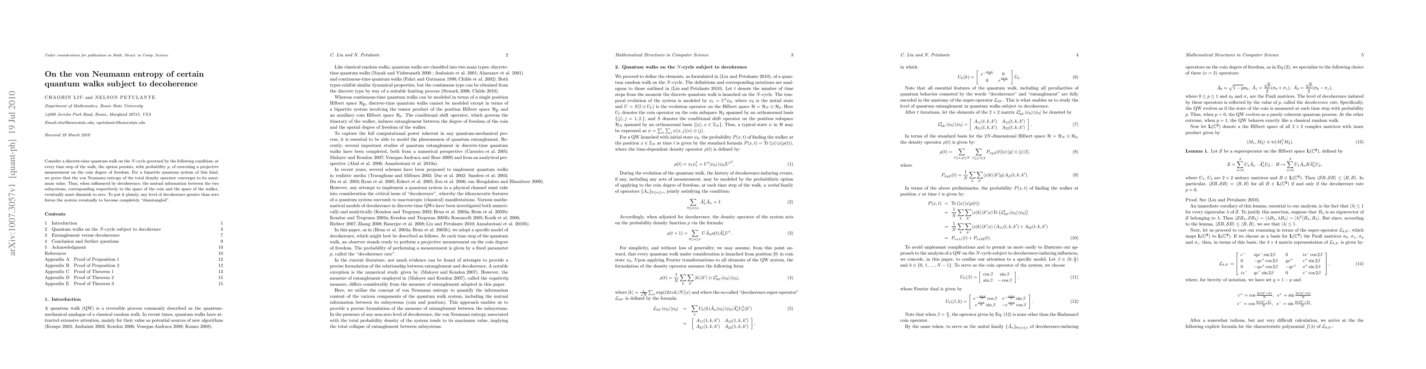 Consider a discrete-time quantum walk on the $N$-cycle governed by the following condition: at every time step of the walk, the option persists, with probability $p$, of exercising a projective measurement on the coin degree of freedom. For a bipartite quantum system of this kind, we prove that the von Neumann entropy of the total density operator converges to its maximum value. Thus, when influenced by decoherence, the mutual information between the two subsystems, corresponding respectively to the space of the coin and the space of the walker, eventually must diminish to zero. To put it plainly, any level of decoherence greater than zero forces the system eventually to become completely "disentangled".}