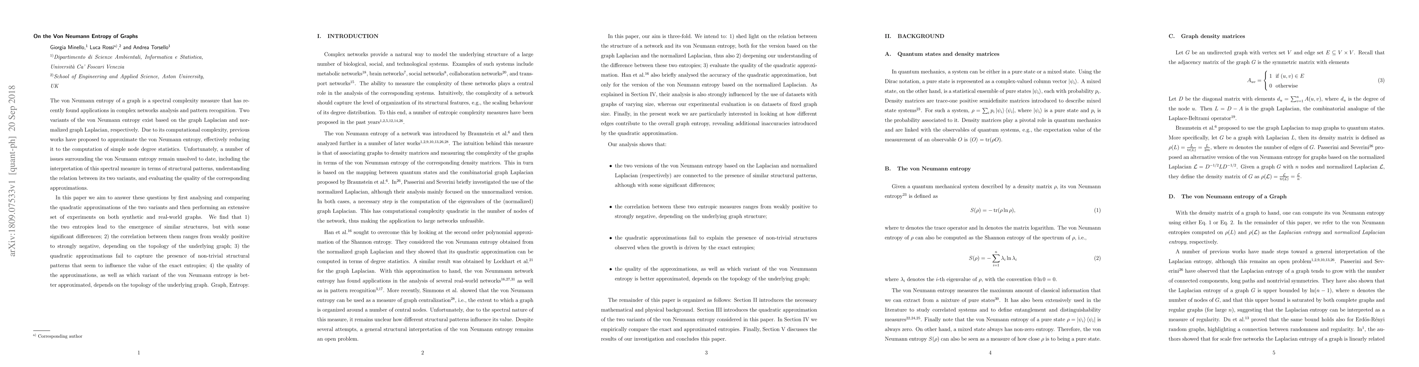 The paper investigates the von Neumann entropy of graphs, finding that two variants lead to similar but distinct structures, with approximations failing to capture non-trivial patterns and quality depending on graph topology.