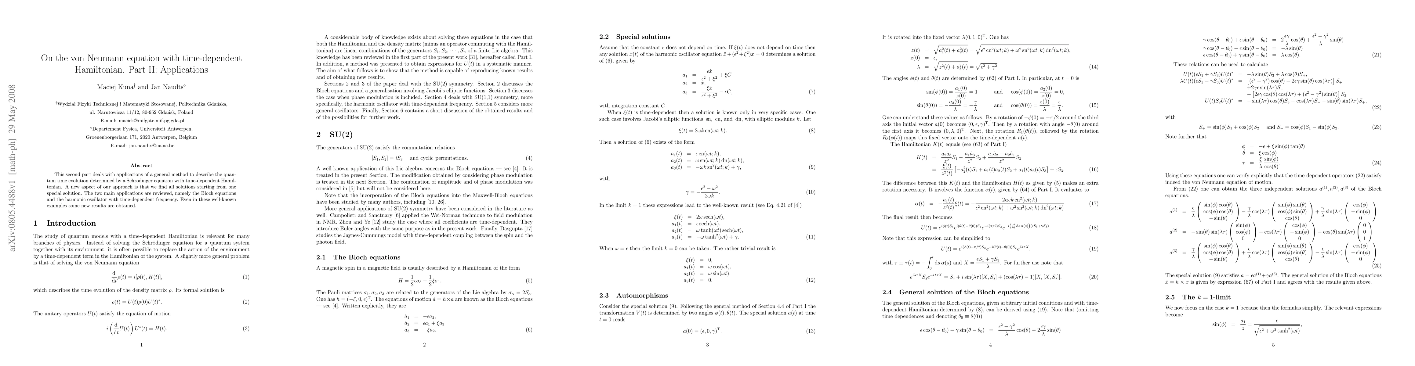 This second part deals with applications of a general method to describe the quantum time evolution determined by a Schroedinger equation with time-dependent Hamiltonian. A new aspect of our approach is that we find all solutions starting from one special solution. The two main applications are reviewed, namely the Bloch equations and the harmonic oscillator with time-dependent frequency. Even in these well-known examples some new results are obtained.
