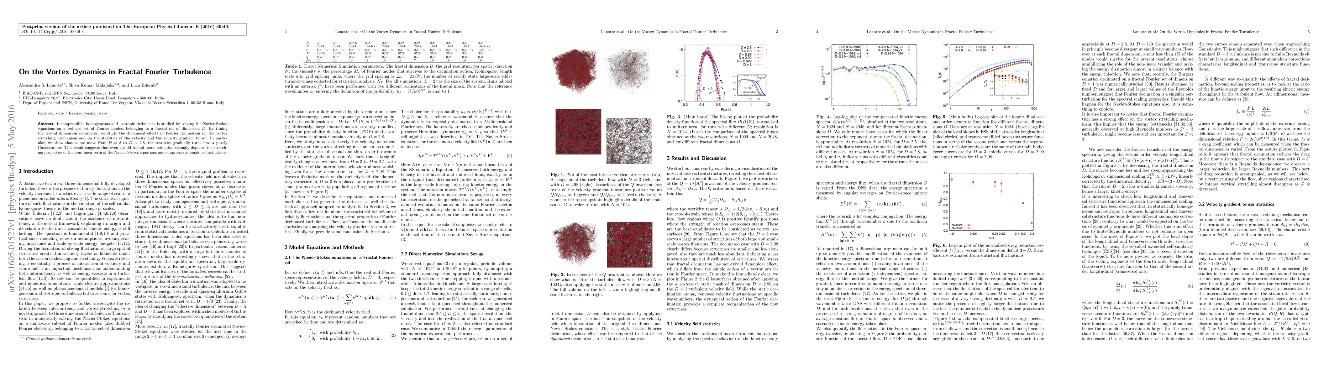 This paper investigates the vortex dynamics in fractal Fourier turbulence by solving the Navier-Stokes equations on a fractal set of Fourier modes. It finds that reducing the fractal dimension from 3 to around 2.8 leads to a transition towards Gaussian statistics, indicating a significant suppression of vortex stretching and anomalous fluctuations.