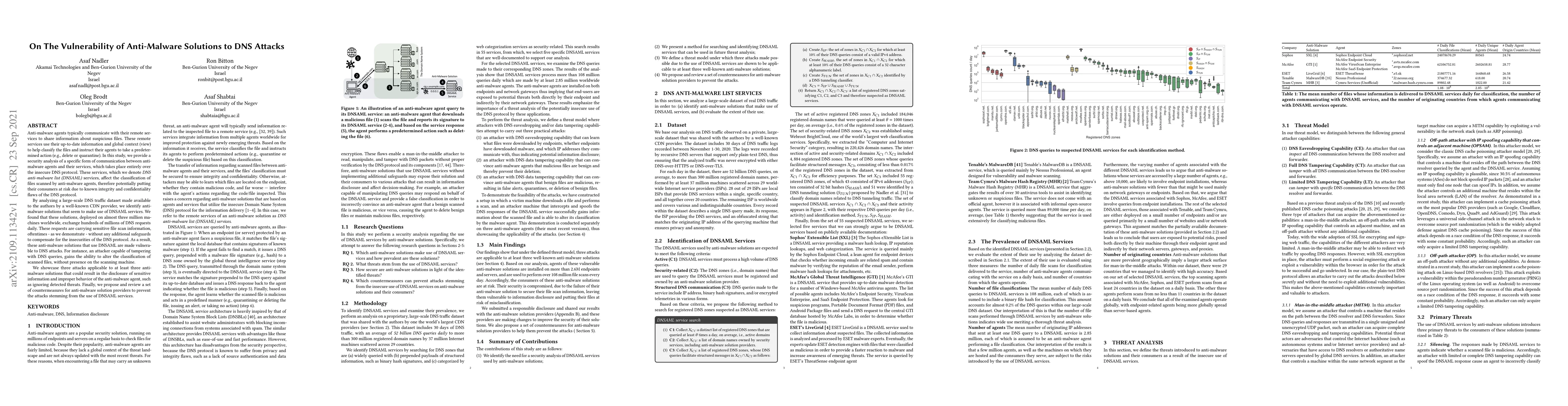 This study analyzes the vulnerability of anti-malware solutions that rely on DNS for communication with remote services, revealing that these solutions are susceptible to DNS attacks due to the insecure DNS protocol. Proposed countermeasures aim to mitigate these risks.