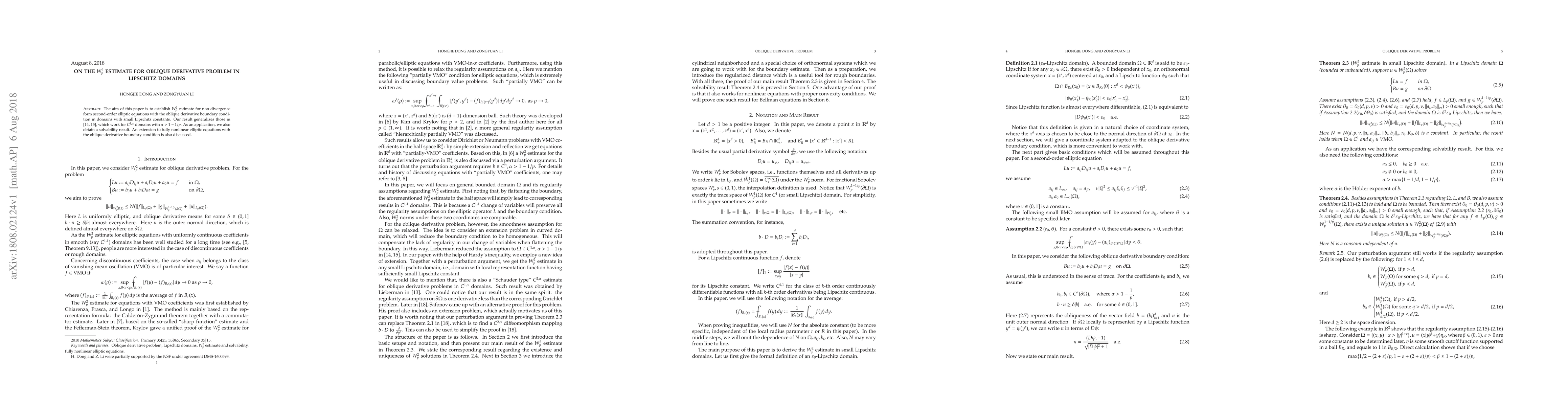 The aim of this paper is to establish $W^2_p$ estimate for non-divergence form second-order elliptic equations with the oblique derivative boundary condition in domains with small Lipschitz constants. Our result generalizes those in [14, 15], which work for $C^{1,\alpha}$ domains with $\alpha > 1-1/p$. As an application, we also obtain a solvability result. An extension to fully nonlinear elliptic equations with the oblique derivative boundary condition is also discussed.