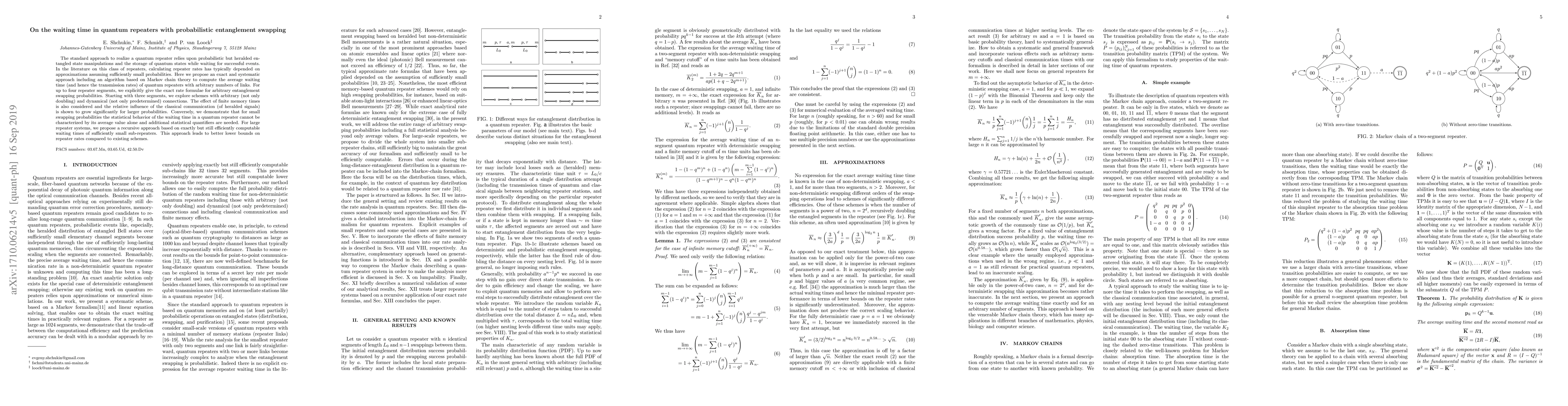 This paper proposes an exact method using Markov chain theory to calculate the average waiting time in quantum repeaters, offering new algorithms for computing transmission rates with arbitrary entanglement swapping probabilities. It highlights the significance of classical communication and the need for additional statistical measures for small swapping probabilities, while also introducing a recursive approach for large systems.