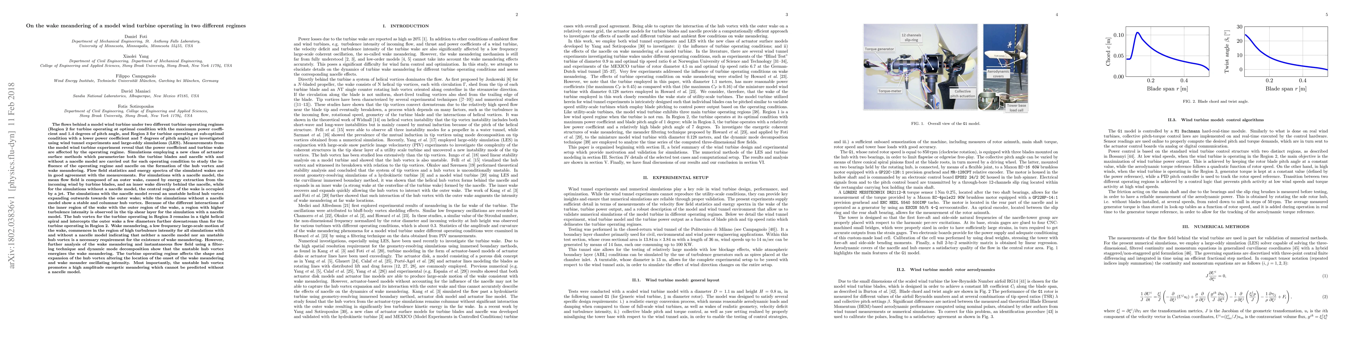 This paper investigates the wake behavior behind a model wind turbine under two operating regimes using wind tunnel experiments and large-eddy simulations. It finds that the turbine operating regime and presence of a nacelle significantly influence the wake structure, with an unstable helical hub vortex energizing wake meandering, which is not solely dependent on the nacelle presence.