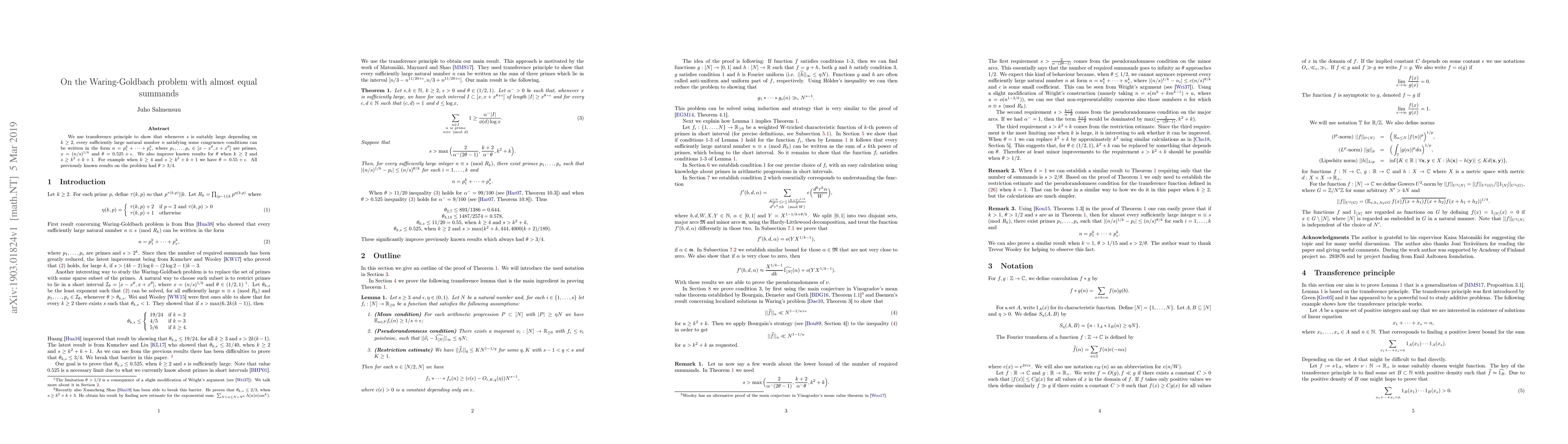 This paper uses a transference principle to show that almost every sufficiently large natural number can be written as the sum of kth powers of primes within a certain range, improving previous results for the Waring-Goldbach problem.